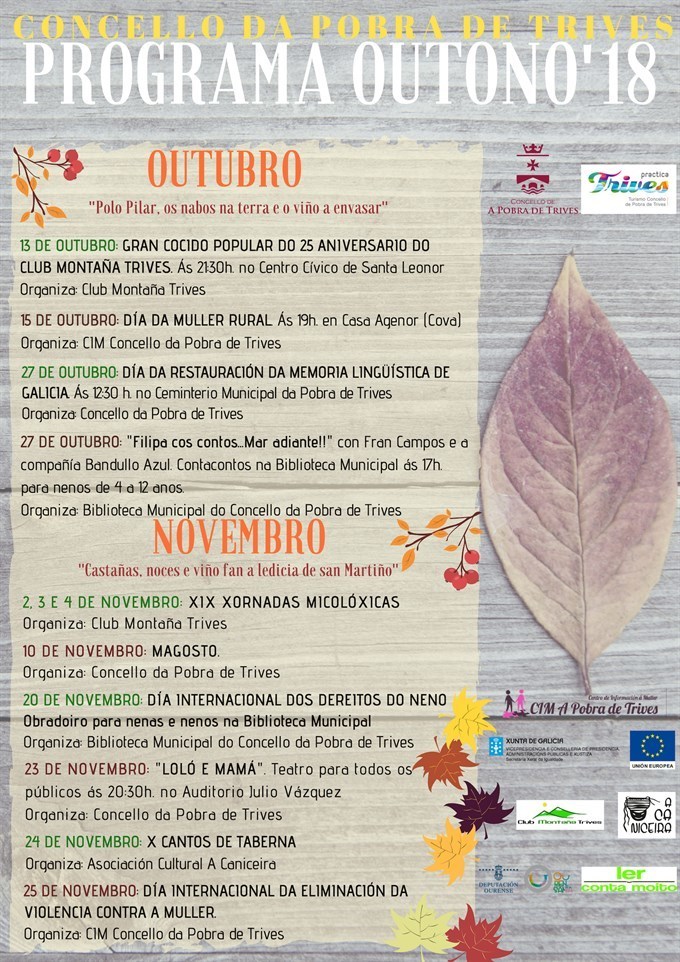 A Pobra de Trives preparou para este outono un conxunto de actividades para tódolos públicos organizadas tanto polo Concello como por diversas asociacións da vila. Trátase dun programa cultural e de ocio que conmemorará, entre outras cousas, varios días internacionais, comenzando polo Día Internacinal da Muller Rural cuxa celebración terá lugar hoxe luns día 15 de outubro ás 19:00 horas en Casa Agenor, no pobo de Cova, organizado polo Centro de Información á Muller.