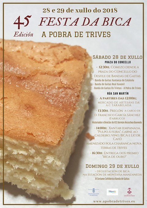 Trives fará entrega dos premios Bica de Ouro, otorgados polo Concello, como recoñecemento a todas aquelas persoas ou entidades pola súa contribución á divulgación e promoción en sectores económico, cultural, deportivo, turístico y patrimonial. E será na data ineludible de exaltación do producto típico por excelencia de A Pobra de Trives que é a Festa da Bica, que este ano chega á súa 45 edición. O vindeiro sábado día 28 de xullo, a partires das 12:00 horas, un mercado de artesanía da A.C.Tarabelada e diversos artesáns e productores da comarca, darán inicio a unha xornada cargada de festexos. O Concello disporá un stand con bicas de todos os elaboradores, e estará en funcionamente ao longo do día para que todo o público poida degustalas e mercalas.