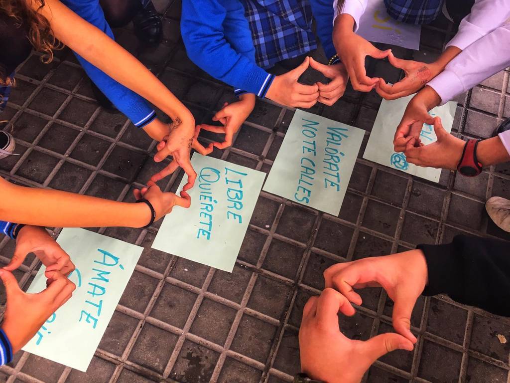 Y como detrás de la tormenta siempre llega la calma, el verde de los papeles se llena de palabras en positivo, es como el sol tras la lluvia. Quiérete, no te calles, se tu misma, valórate, sonríe, ámate..., enceradas en corazones hechos con las manos de los participantes en el clip, pone fin al trabajo de estos chicos y chicas.
