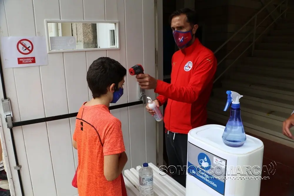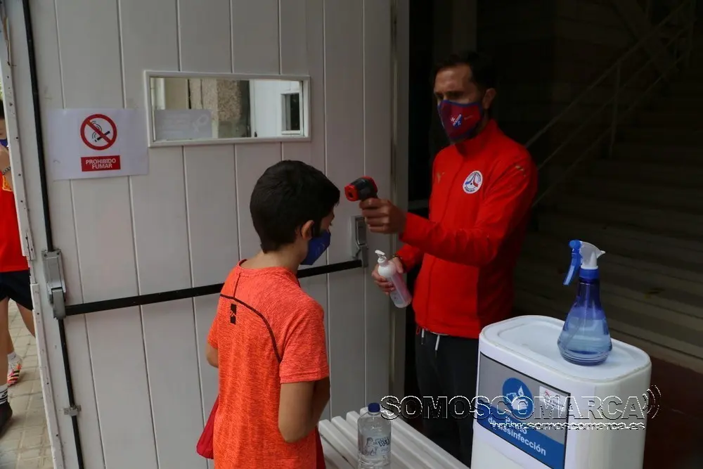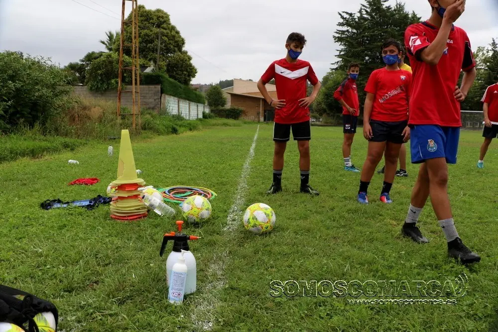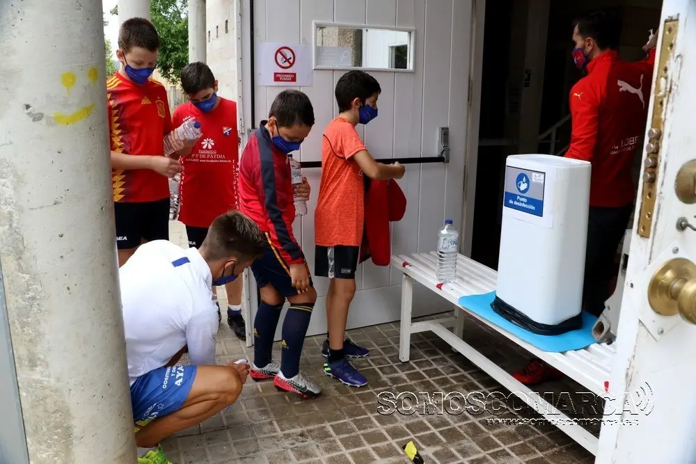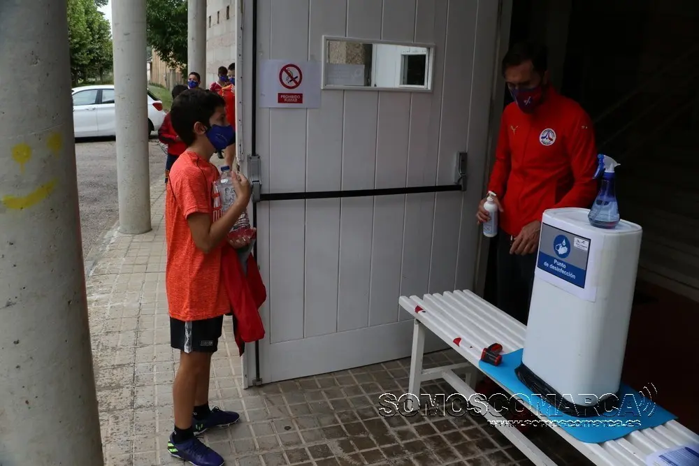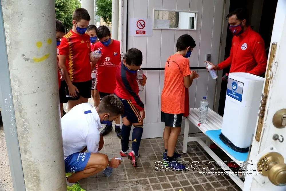 Los deportistas. con edades comprendidas entre los 10 y los 15 años, han realizado diversas actividades futbolísticas siempre con los elementos de protección como son las mascarillas presentes. Así mismo todo el material utilizado es desinfectado tras su uso y durante los descansos, que se realizan en el pabellón municipal, se sigue un protocolo anti-Covid.