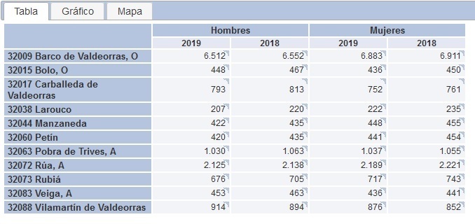 Prueba de ello es la comarca de Valdeorras así como A Pobra de Trives, en solo doce meses se han perdido 326 habitantes. Y es que, según los datos del padrón municipal a 1 de enero de 2020, en los concellos de O Barco, Rubiá, Carballeda de Valdeorras, Vilamartín, A Rúa, Petín, Larouco, Manzaneda, O Bolo, A Veiga y A Pobra de Trives, habitan un total de 28.437 personas frente a las 28.763 que lo hacían el 1 de enero de 2018.