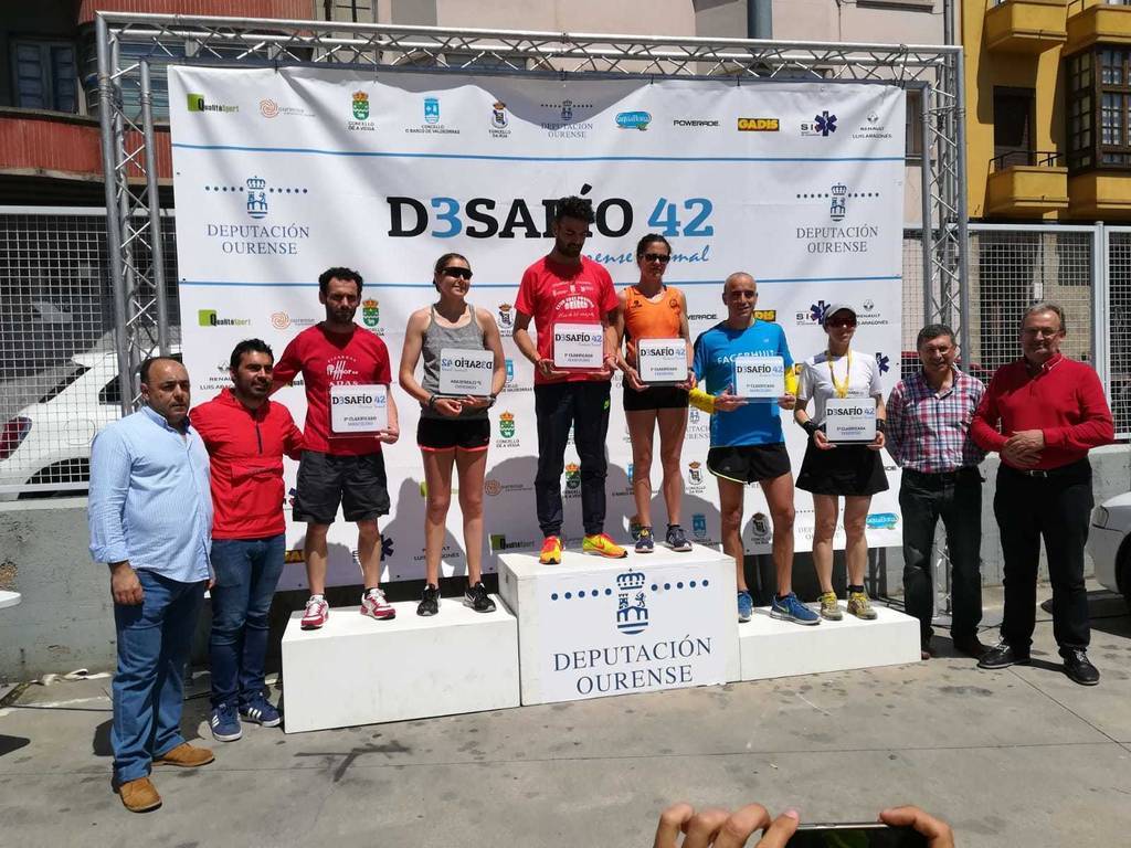 El atleta del ADAS Alejo Ares y la del Burgas Atletismo Ourense Sonia Tejeiro son los vencedores absolutos en las categorías masculina y femenina de la V edición del "Desafío 42 Ourense Termal". Ambos ganaron las tres carreras que se disputaron este fin de semana en tierras valdeorresas, La K6 de AVeiga, la K15 de O Barco y la K21 de A Rúa, con la que se completaron en 24 horas los 42 kilómetros de una maratón con pruebas totalmente diferentes y que supusieron para los atletas un gran reto y gran desgaste y esfuerzo.