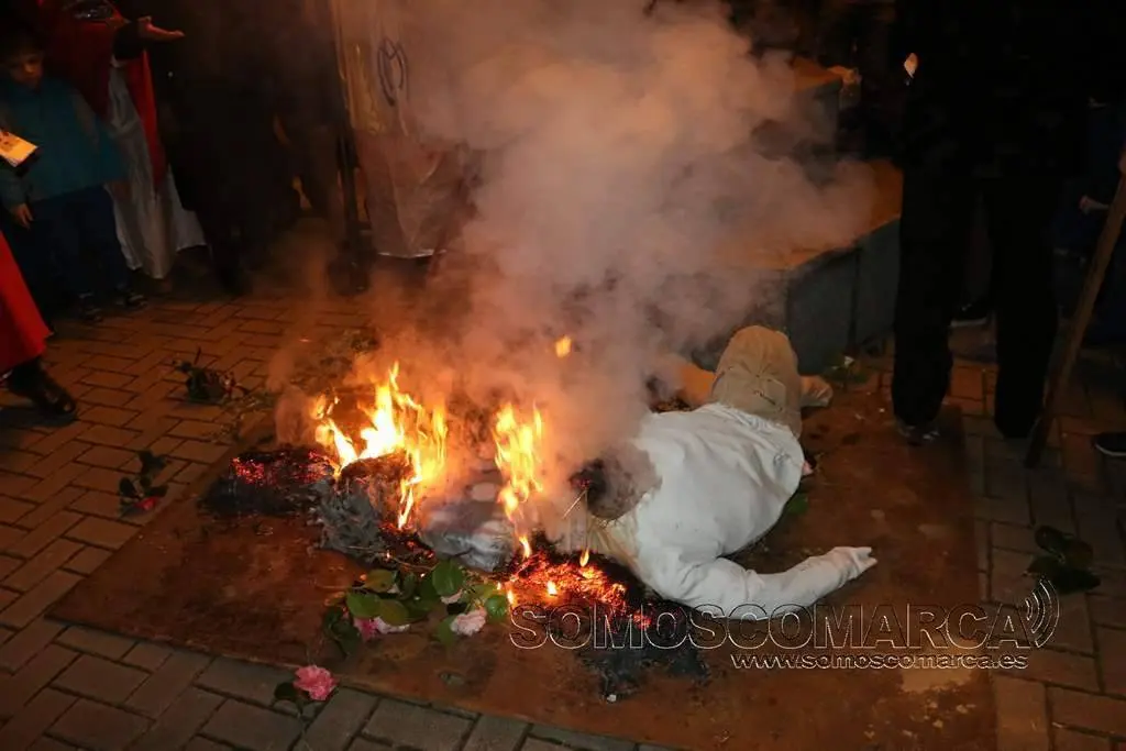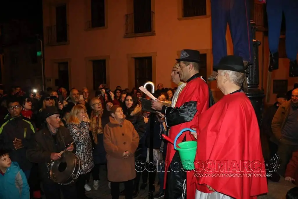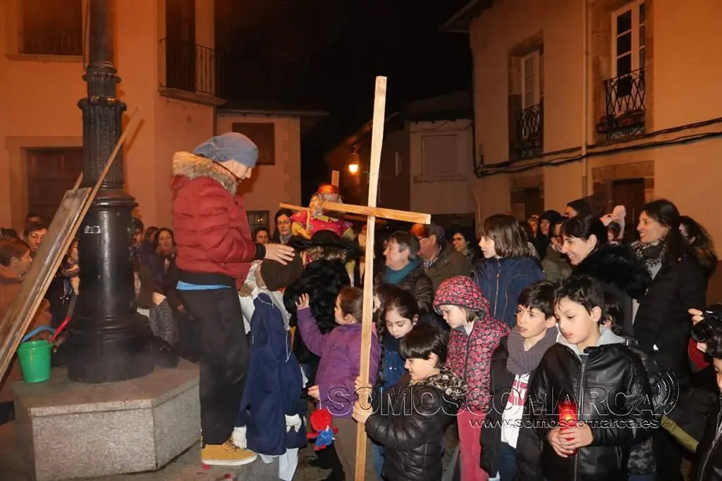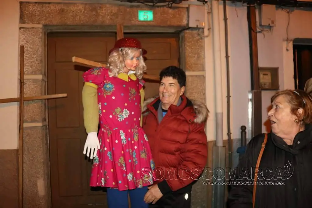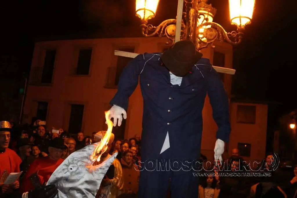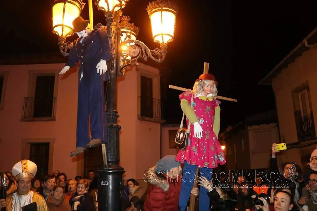 Al llegar a la Plaza César Conti, la ceremonia del adiós vivió otro de los momentos más esperadas. Los «mecos» —la comadre y el compadre—, que durante los días de Entroido lucieron suspendidos sobre la farola de este espacio público, descendieron para ser arrojados y quemados en la hoguera junto a la sardina.