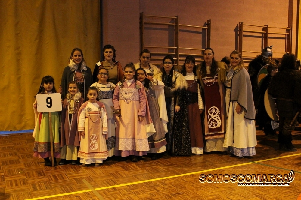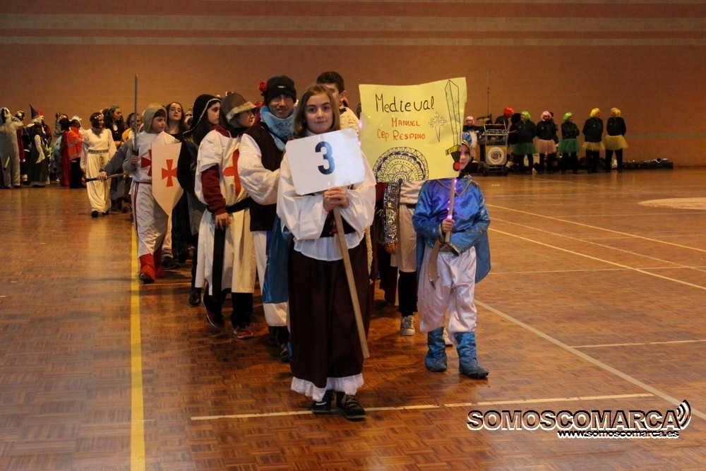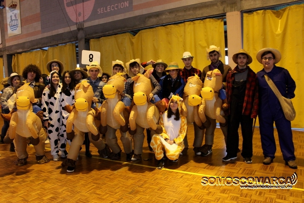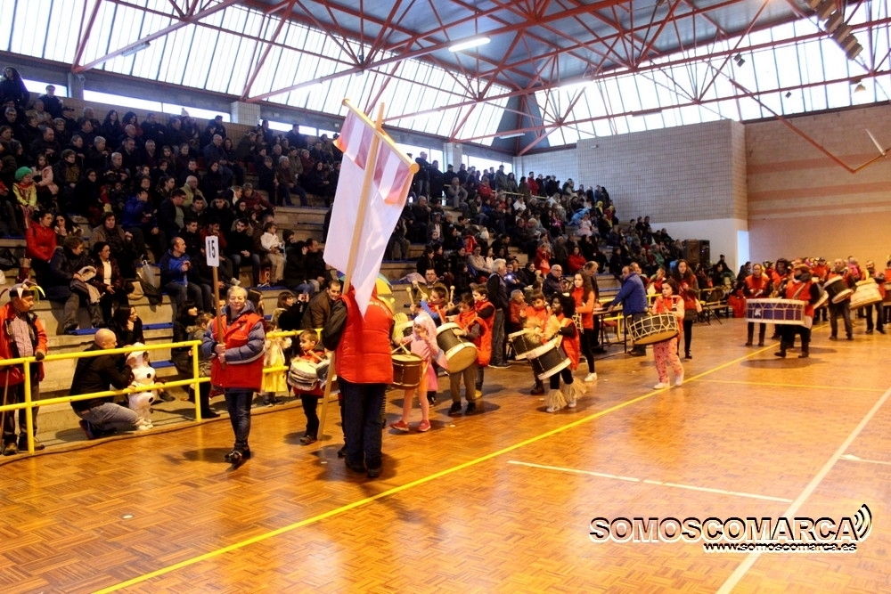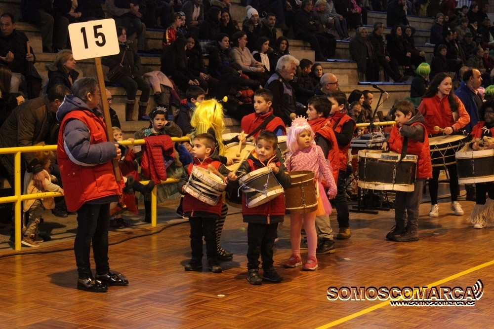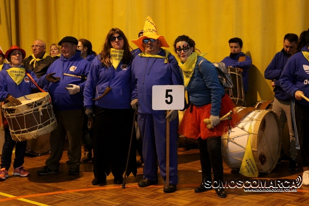 Cambiando el asfalto por el parquet, cada una de las 16 comparsas participantes fueron desfilando por el municipal rués con más de medio millar de espectadores en unas gradas que estaban a rebosar.