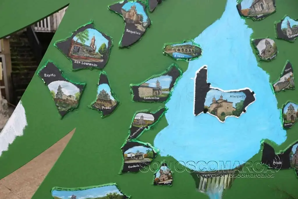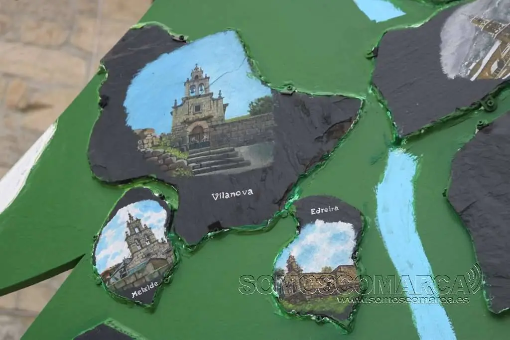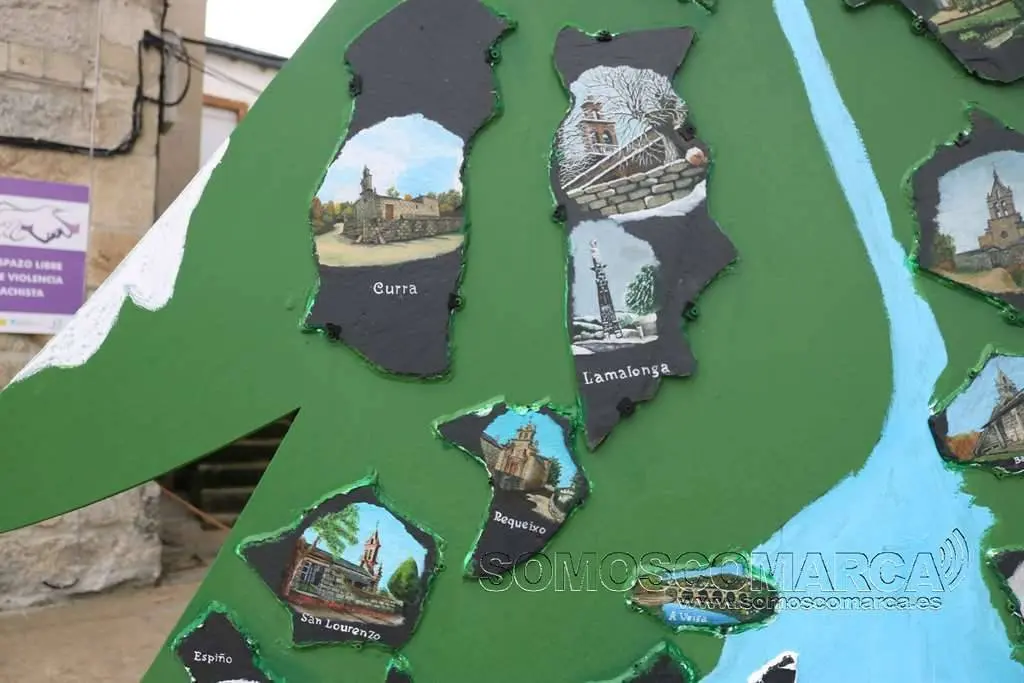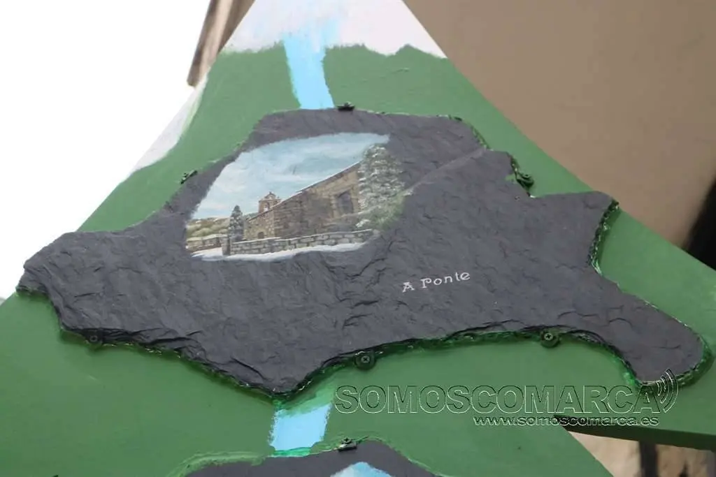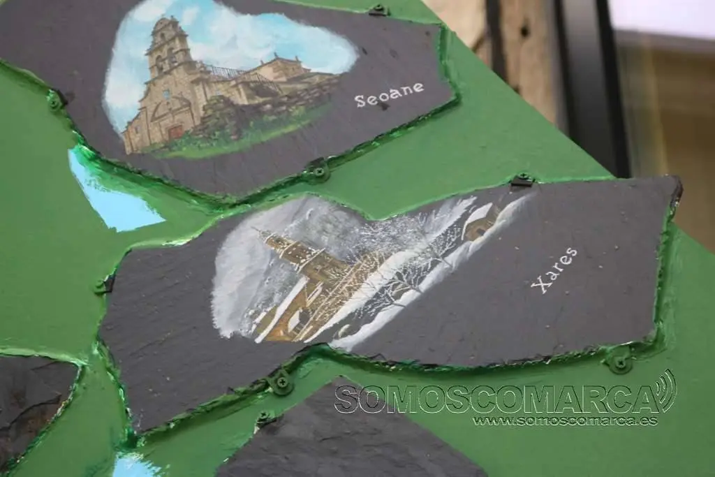 Singular é tamén a árbore de Nadal na praza do Concello, onde cada adorno é un cacho de pizarra cunha paisaxe ou o máis significativo de cada vila do municipio, pintada por Miguel Ascón, veciño de Xares e renomeado artista moi coñecido polas súas pinturas.