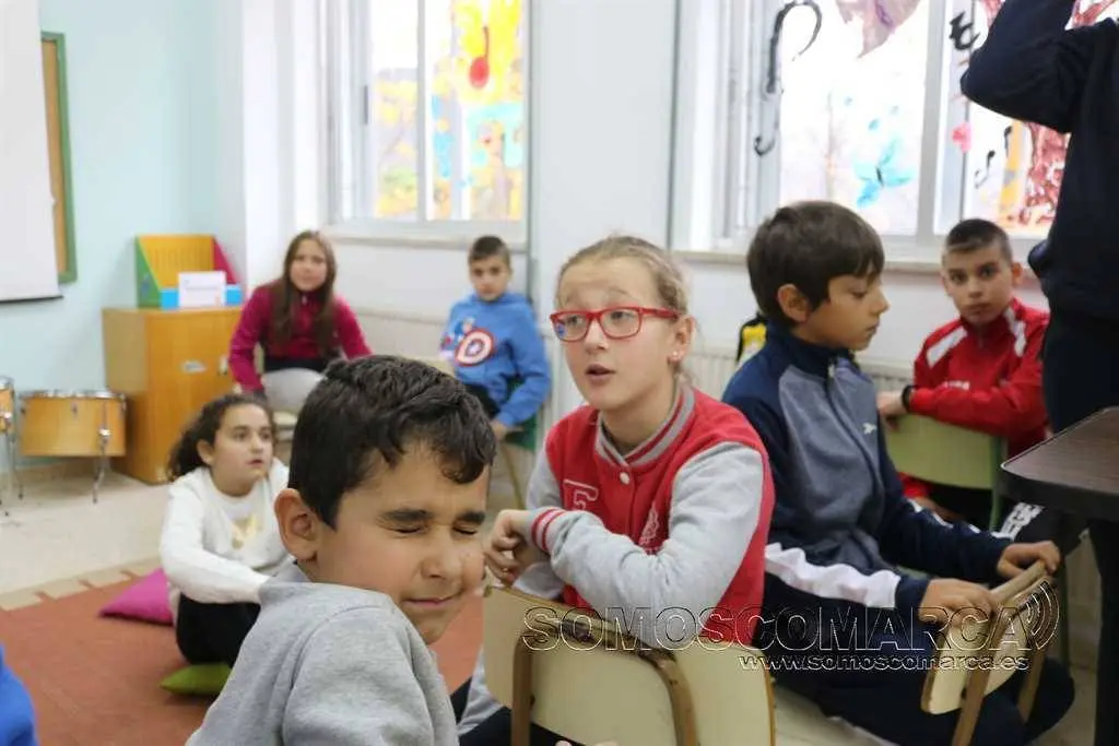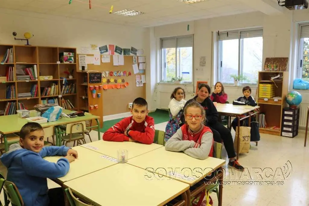 A xornada é partida —os nenos van xantar as súas casas— e comeza ás 9:30 horas. Até as 9:50 soben a biblioteca onde len un libro, contan un conto ou din un trabalinguas. Cando os visitamos no espazo «Menuda Tropa», Leire foi a encargada de ler e para elo elixiu «La mona Ramona» logo díxolles aos seus compañeiros un trabalinguas.