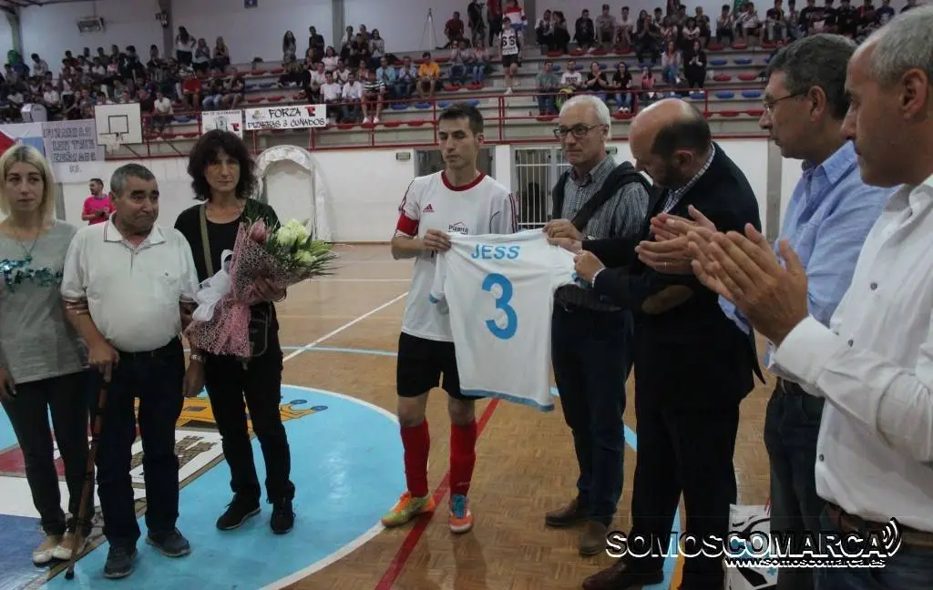 Tras el descanso el presidente de la Real Federación Galega de Fútbol, Rafael Louzán, junto al responsable territorial del fútbol sala galego, entregaron a la familia de Jesús Carrera, una camiseta de la selección autonómica grabada con el nombre de Jess, un ramo de flores y un cheque por valor de 12.000 euros de la mutualidad de deportistas de la FGF.