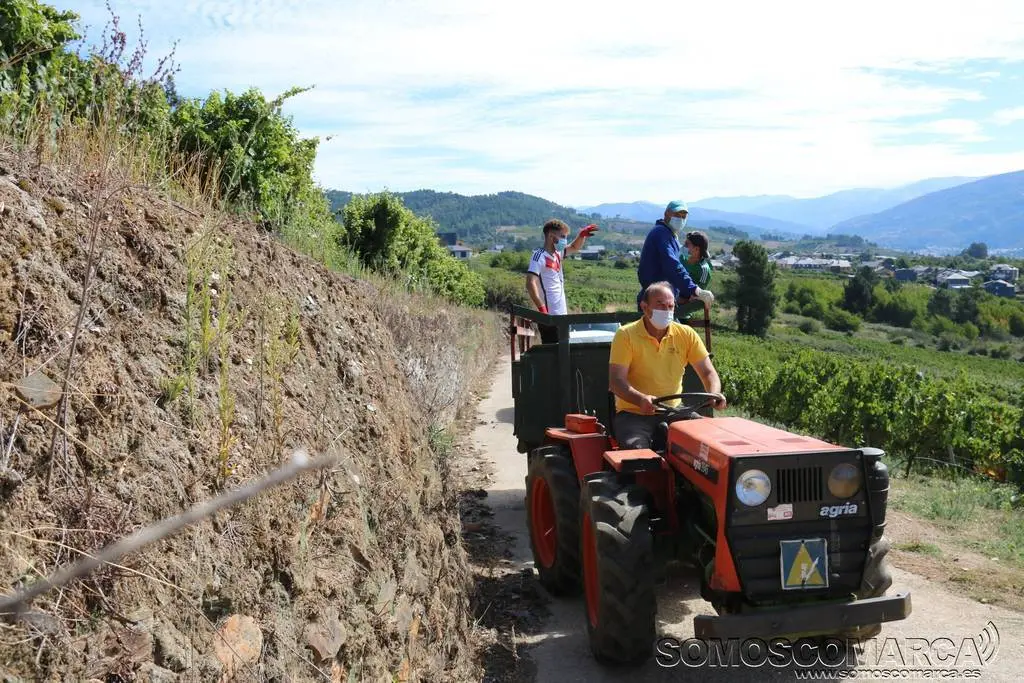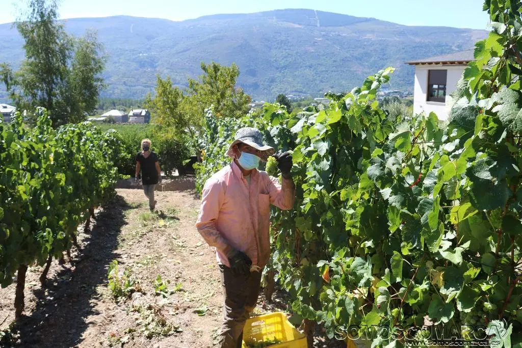 Pero no es suficiente. Dentro de la viña se respetan las medias de seguridad y la mascarilla es obligatoria. Algo que complica la labor debido a las altas temperaturas que se están registrado estos días en Valdeorras. «Es complicado porque tienes que estar todo el rato mirando la distancia. Preocupa bastante. Hay mucha gente que no conoces, por eso mantenemos los espacios», explica uno de los empleados de la Bodega D`Berna.