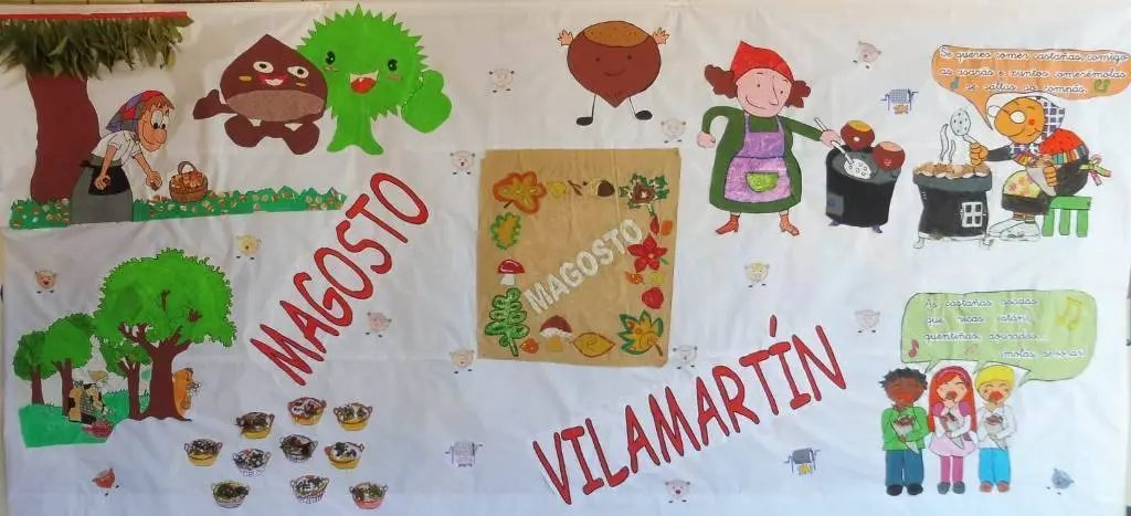 O alumnado ademais de facer un mural cos produtos de outono a entrada ao colexio, tamén confeccionaron os seus propios xogos. Asi, no patio nun taboleiro pintaron castañas as que lle fixeron un buraco no cu para logo tirar este froito do outono a ver si entraba polo buraco e así conseguir puntos. Houbo unha xincana, e para rematar a xornada festiva, xogos populares.«