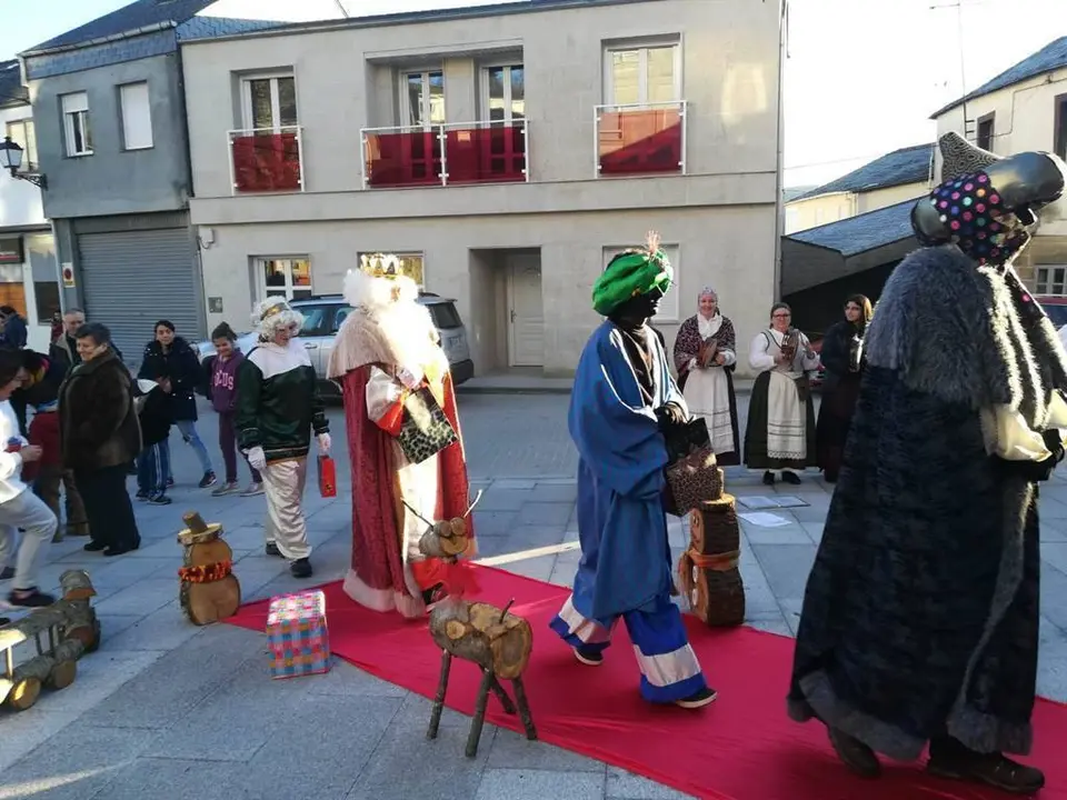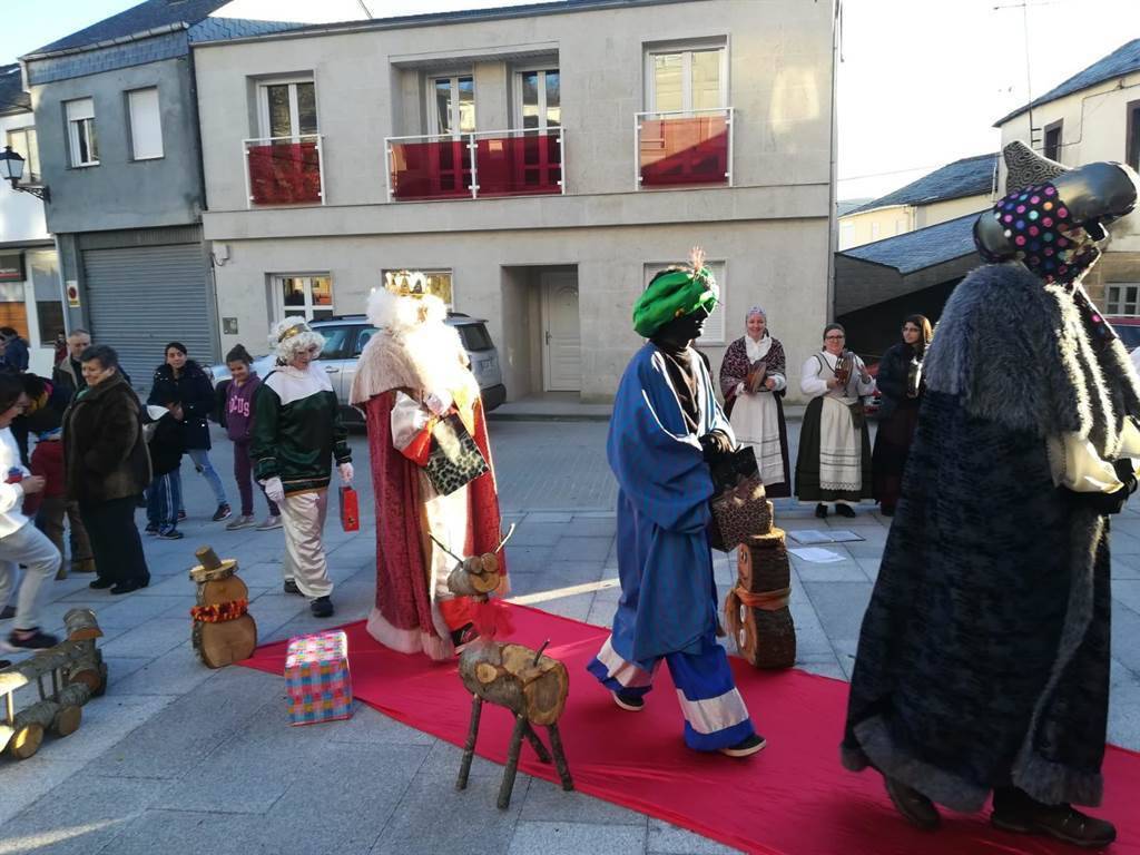 As Súas Maxestades de Oriente accederon ao Concello da Veiga a través dunha alfombra vermella pola praza que lucía coma nunca, con orixinais figuras de renos ou bonecos de neve feitos en pau de carballo e decoración usando recursos naturais.