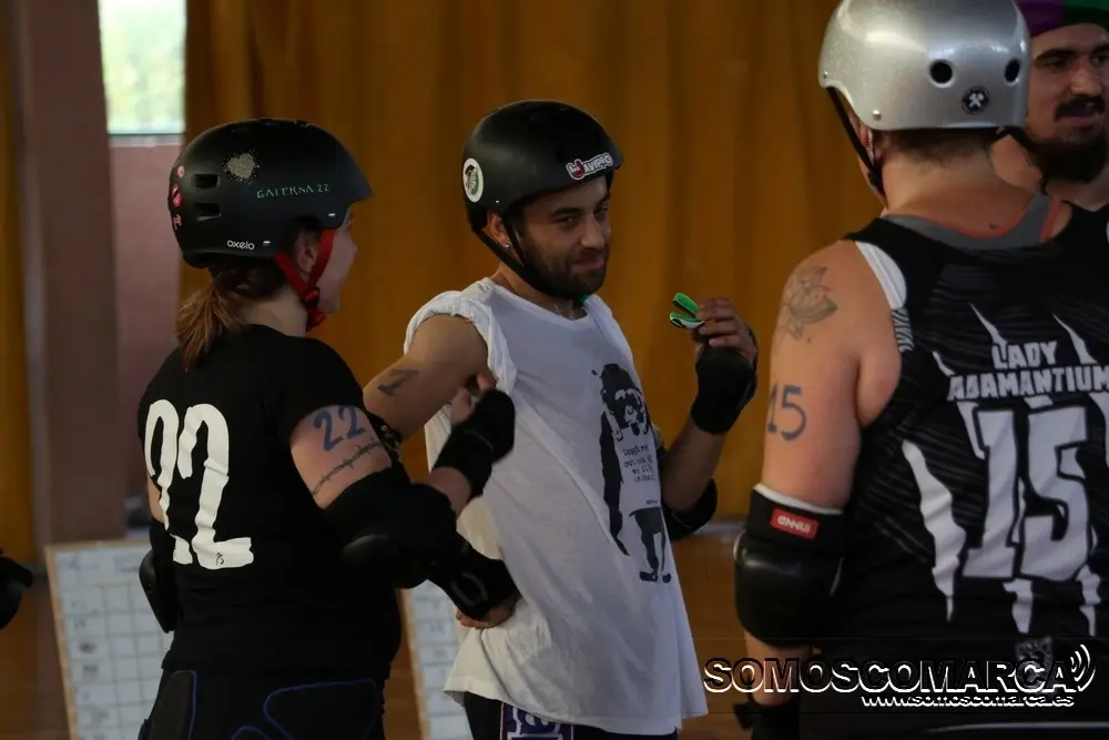 Las otras cuatro personas son los bloqueadores que tendrían que encargarse de que su estrella, su jammer, pase al resto de jugadoras y que la estrella del equipo contrario no les gane la posición. Y esto se hace a través de bloqueos con la cadera, con los hombros, etc. Es un deporte muy rápido.