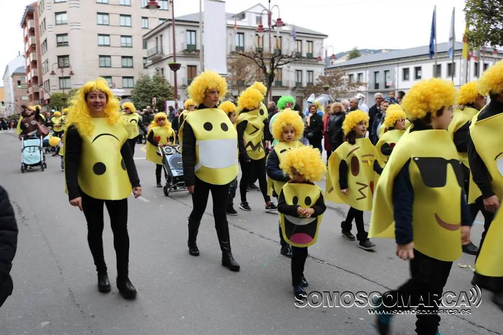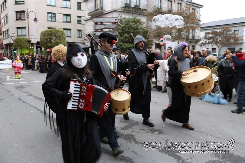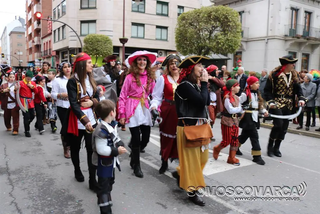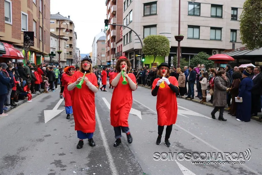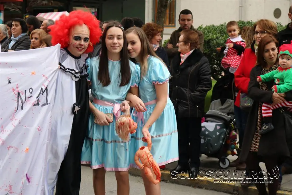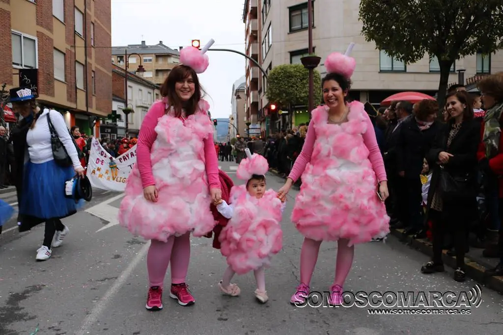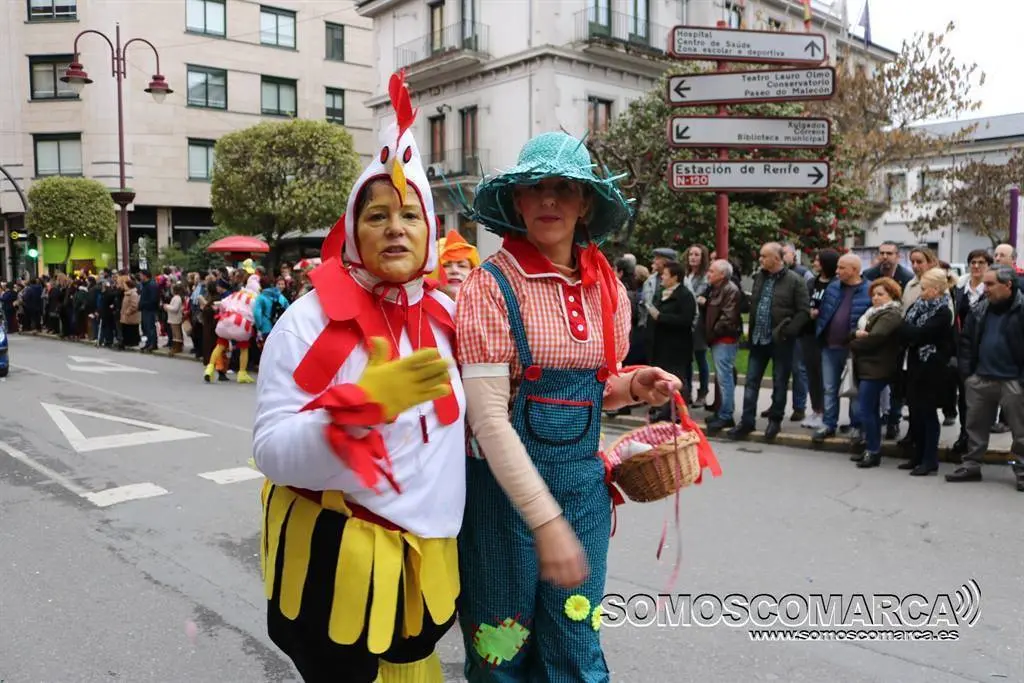 E así o fixeron cerca de vinte comparsas. O desfile abriuno unha muller vestida cunha bata, un sombreiro e acompañada por unha cabra e un can ataviados para a ocasión. Detrás dela unha charanga animaba o cotarro. Logo as Martas 13 e detrás delas os Comecocos. Seguiulle unha comparsa do medievo, e a esta unha galletas de xenxibre. Cans, Mariquitas, ratos con Ratibrón, emoticonos, súper heroes, bonecos de neve, algodón de azucre, e hasta os canons da guerra de secesión americana ou os San Fermíns con toros incluídos. A comparsa da Santa Purrela e os polos e pitas das Amas de Casa do Teixadal, Pero sen dúbida a mais numerosa e colorida foi a do circo do Ceip Julio Gurriarán na que ata estaban os pallasos da tele. A dos Piratas sen Caribe do Divina Pastora tamén estivo ben animada o igual que a dos Dálmatas de Córgomo. O desfile cerrárono Os Viticultores de Vilamartín que animaron cos seus bombos o desfile.