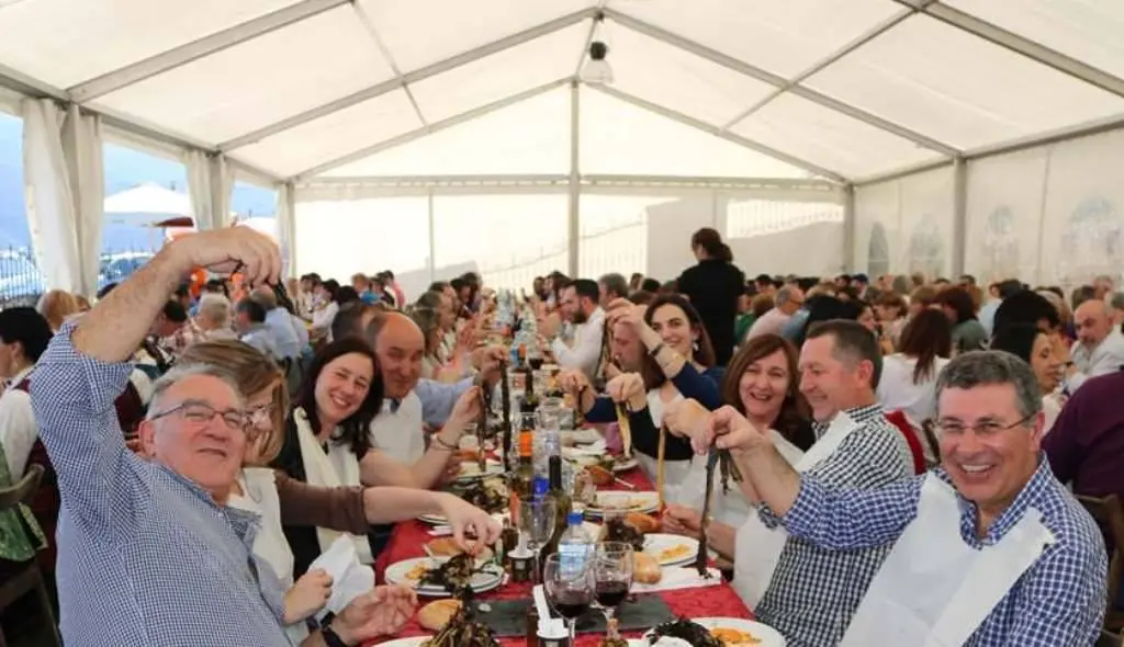 Despois deste entrante singular a vez que exquisito, os comensais sentaron a mesa para dar conta das porretas asadas en leña de aciñeira, con salsa Bela — salsa de orixe portugués feita con abelás, amendoas, catana seca, vinagre de godello artesan acompañado de aceite da zona do castro e outarelo—. Logo das porretas un chourizo con cachelos para pasar ó cabrito asado, prato que non falta en calquera festa que se prece. O acompañamento da carne non podía ser outro cunha boa ensalada de inverno. De sobremesa leite frito e acompañando a todos estes manxares viño da D.O. Valdeorras. Para rematar, café e licores.