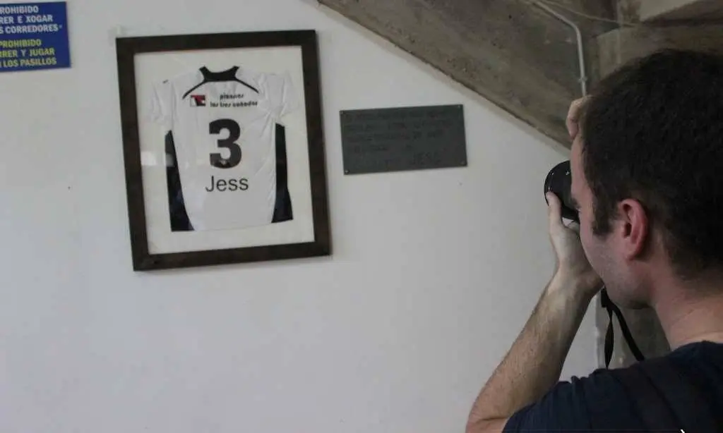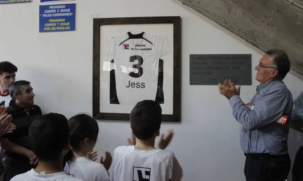 Los más pequeños hicieron entrega de un ramo de flores a la madre de Jesús y Bruno, quien junto con el padre descubrió la camiseta enmarcada con el 3. En el lateral una placa en la que se lee, «O noso partido non rematou. Seguimos xogando contigo. Nunca deixarás de vivir connosco. Sempre JESS».