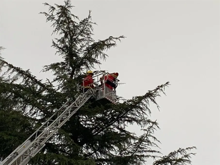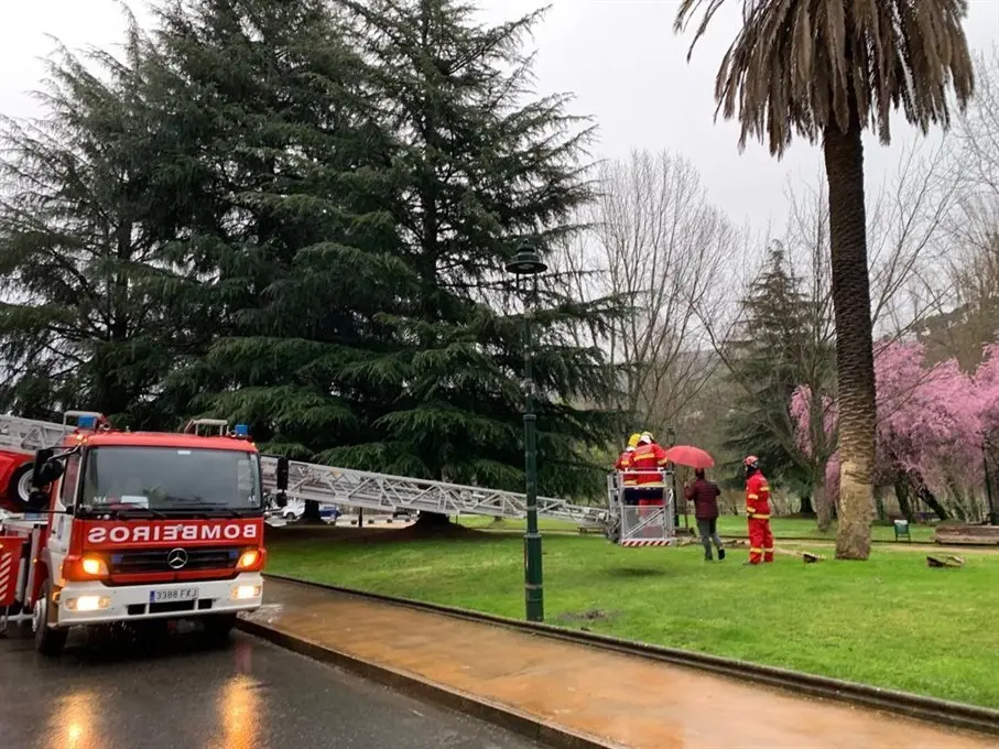 Concello y bomberos del Parque Comarcal actúan desde primera hora cortando las ramas más altas de los pinos del jardín botánico