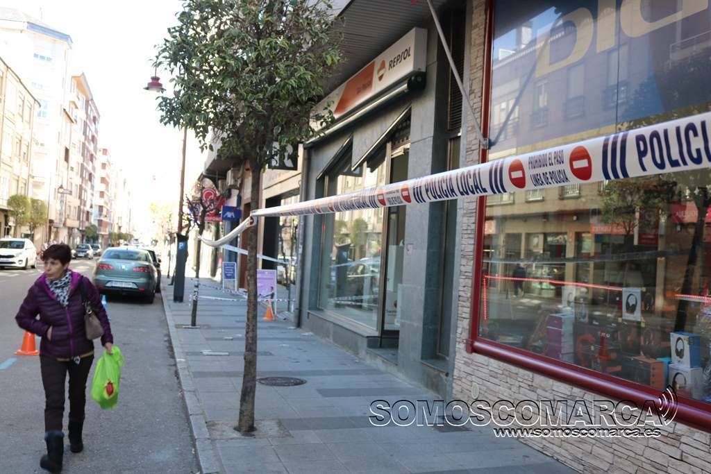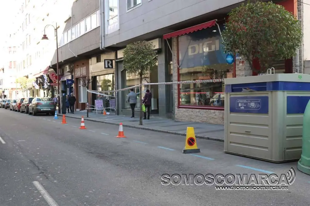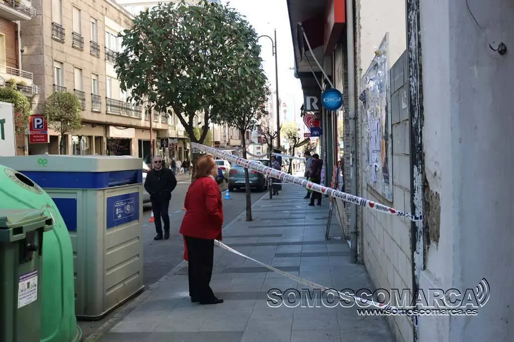 Esta mañana, parte de la acera de la avenida de la Estación, a la altura del número 1 —frente al Teatro Lauro Olmo— era señalizada con un precinto por la Policía Local de O Barco, debido a la caída de cascotes provenientes del alféizar de una de las ventanas del edificio situado en la citada avenida y que hace esquina con el paseo de O Malecón.