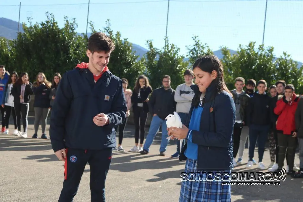 Os rapaces do Cosme López da Rúa recurriron á música para atraer á Paz. Aos violíns de Silvia e Julia, ás guitarras de Roberto e Paula, á percusión do alumnado de 4º ESO, e incluso ao piano de Alba, a mestra de música. Tamén lle fixeron unha obriña de teatro e unha vez máis, encheron o ceo de globos brancos.