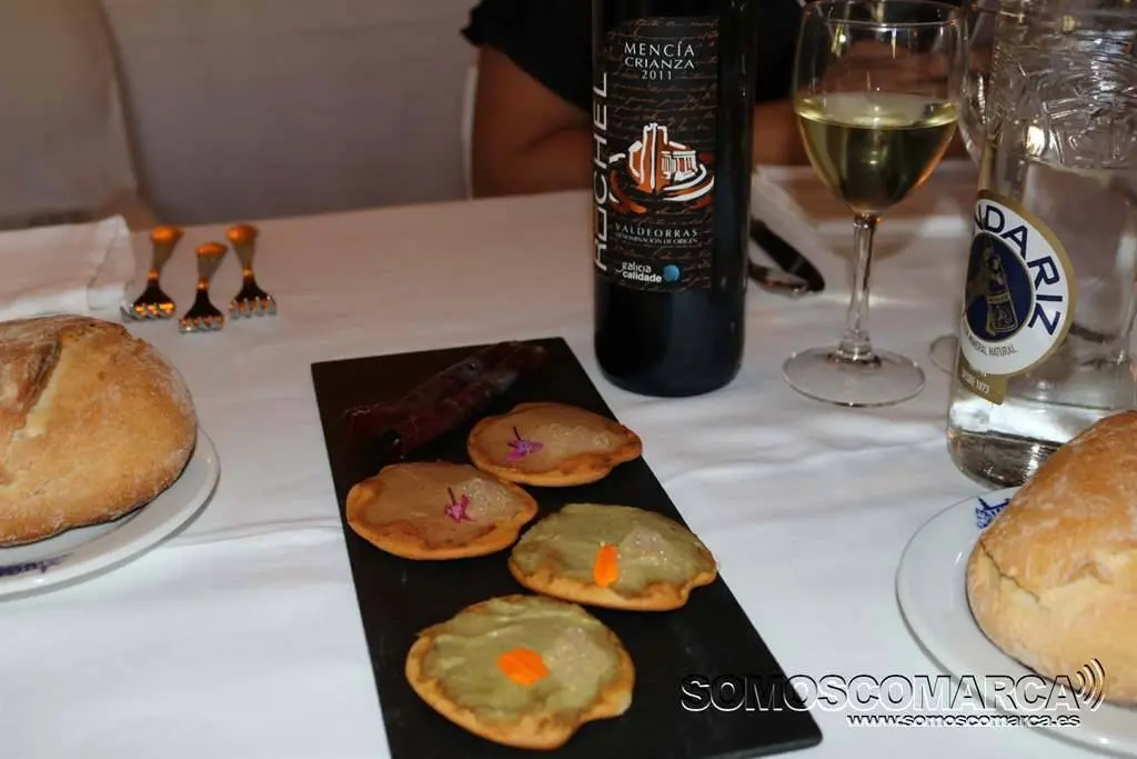 Vermut Petroni, con botellas personalizadas para el evento, en la terraza; luego comida en la que el plato principal fue la ternera. “Quisimos que el menú reflejase el tipo de comida que se come en la comarca, así como los vinos de Valdeorras. A Coroa puso su vino blanco y Ruchel un Mencía”, aseguraba Chus. El menú estuvo formado por tostas marineras con paté de ostra y centollo, saquito de repollo de Asa de Cántaro relleno de arroz con botelo sin hueso y Chantarellus Cibarius, para finalizar con tarde de Castaña con chocolate.