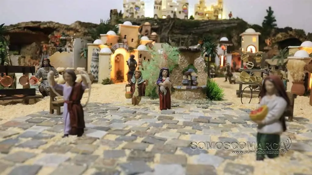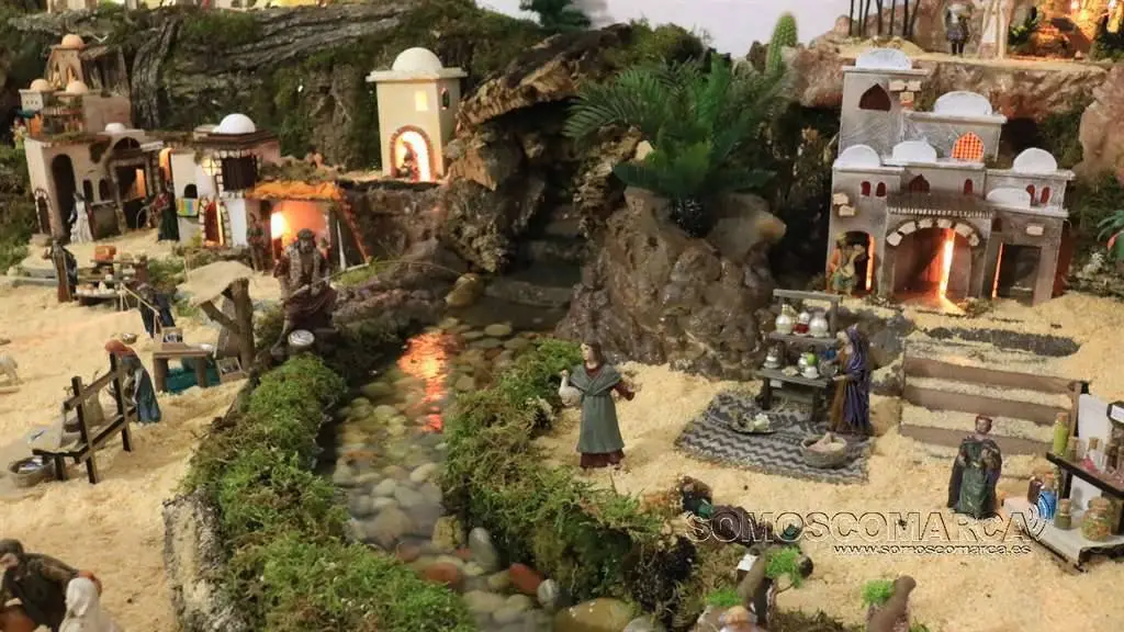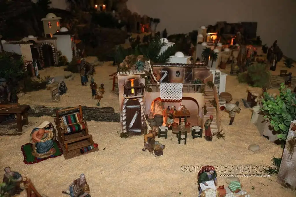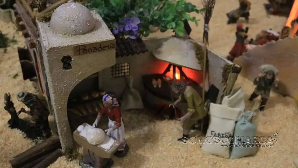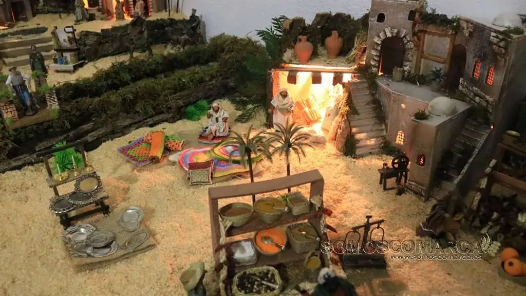Divídese en dúas zonas, segundo nos conta Sonia Sarria, atendendo ó poder económico das xentes. «Fomos facendo un orde, pondo as cousas máis ricas máis cerca do castelo: a botica, as xoias, alfombras, teas e especias», sinala Sonia. Na parte esquerda está o presebe co co nacemento, e nesta zona o horto, as pitas, o rabaño de ovellas e até un carro con palla.