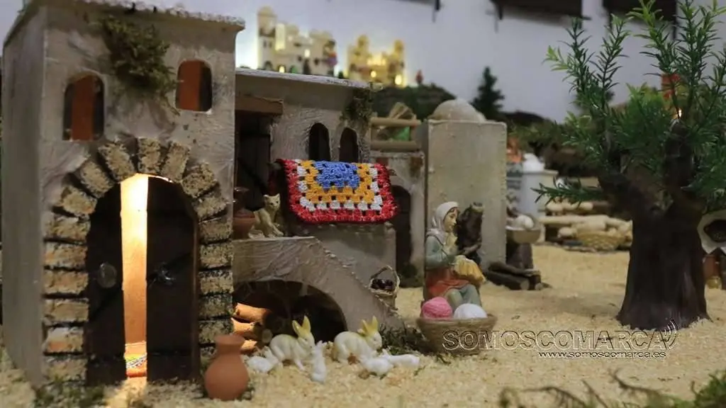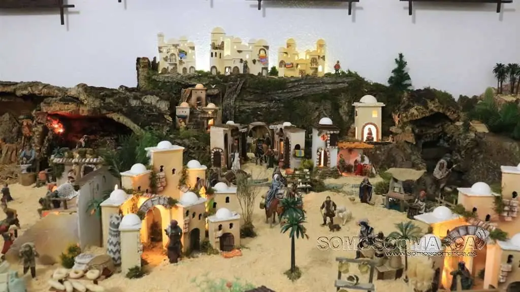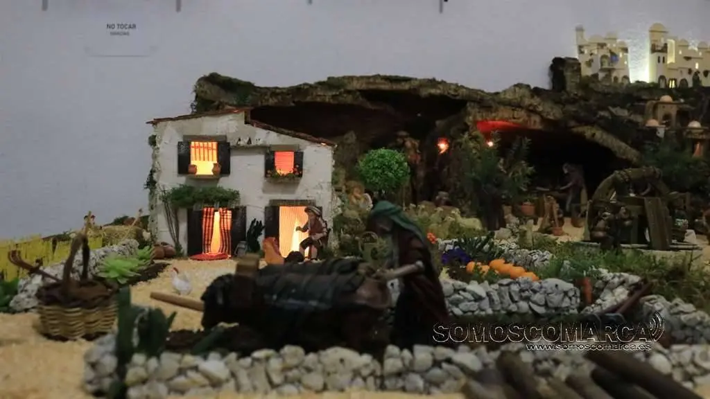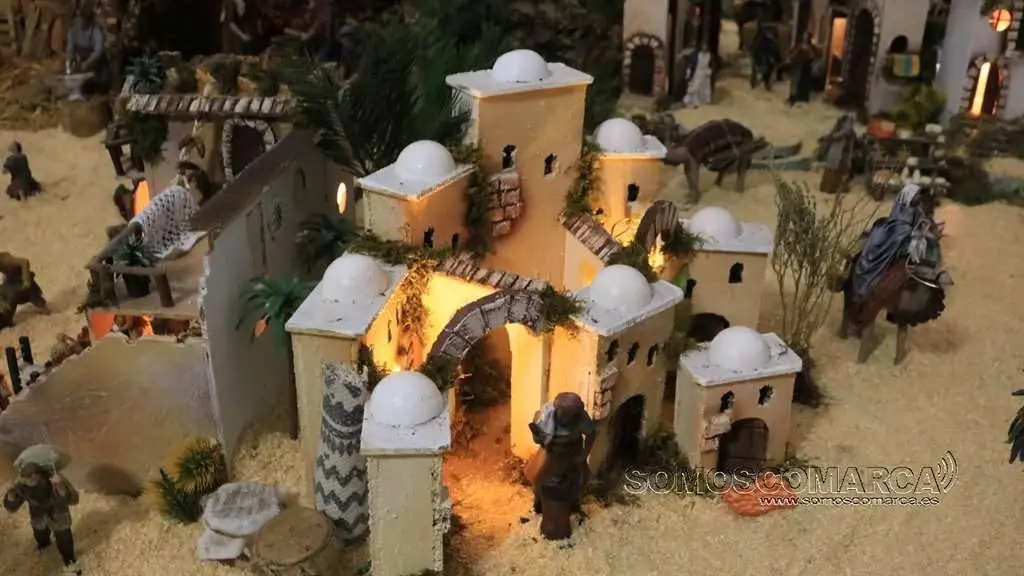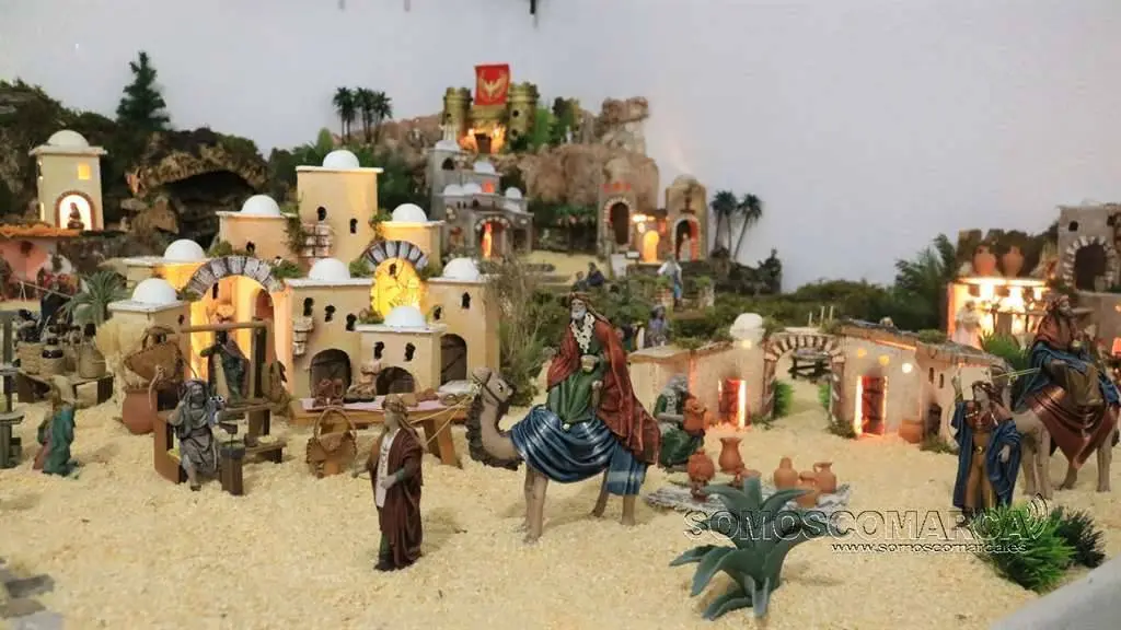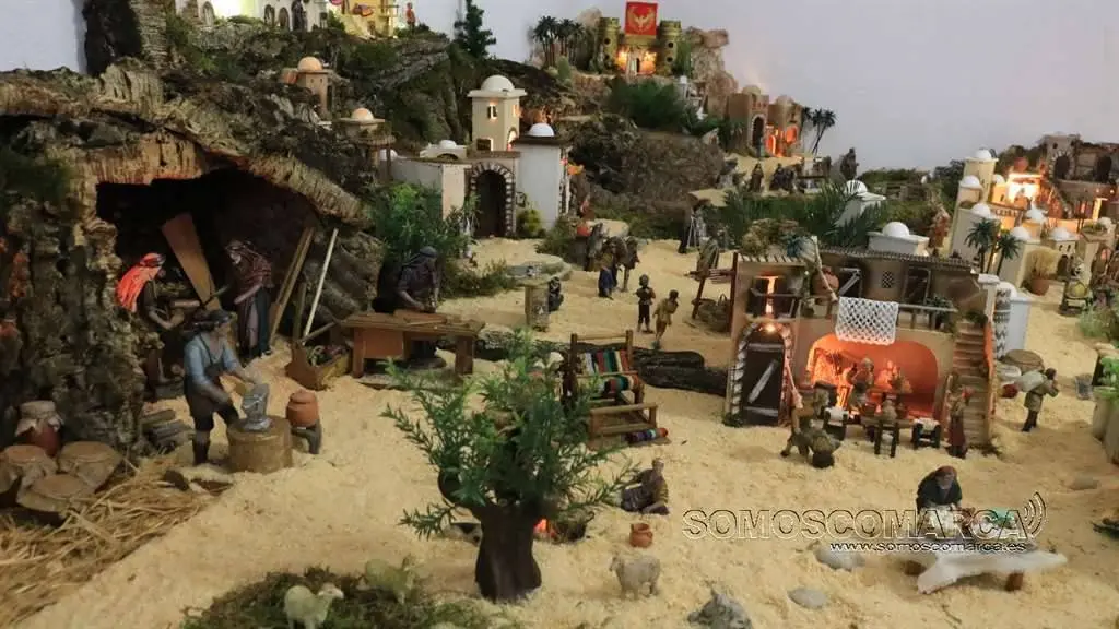 Divídese en dúas zonas, segundo nos conta Sonia Sarria, atendendo ó poder económico das xentes. «Fomos facendo un orde, pondo as cousas máis ricas máis cerca do castelo: a botica, as xoias, alfombras, teas e especias», sinala Sonia. Na parte esquerda está o presebe co co nacemento, e nesta zona o horto, as pitas, o rabaño de ovellas e até un carro con palla.