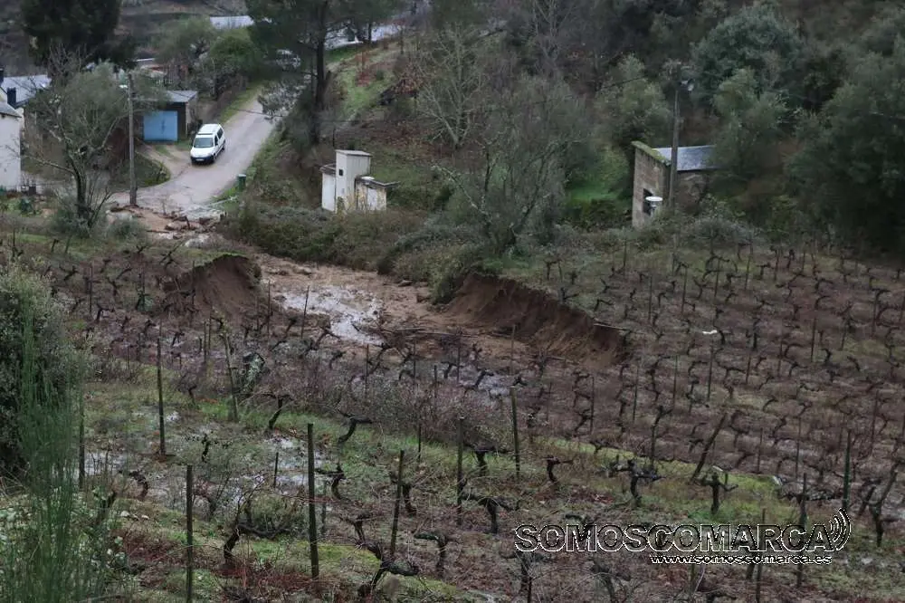 A primera hora de la mañana una tajea, que es una construcción que permite el drenaje transversal de las aguas superficiales bajo otra infraestructura, como un camino o carretera situada en la vía que va de A Rúa a Viana, OU-533, embalsó en una viña, provocando el colapso del terreno viniéndose abajo.