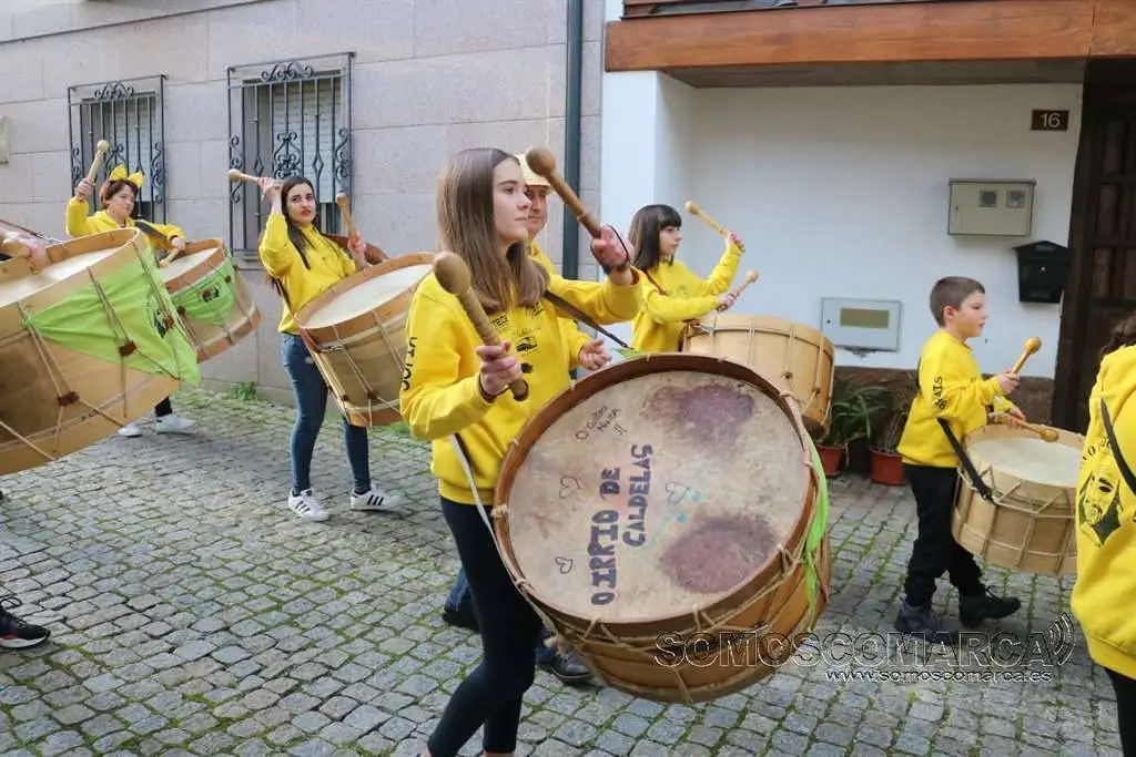A continuación a cor amarela do folión dos do Irrio de Caldelas tinguiu a estreita rúa Santiago. Fixeron o propio, facendo soar os seus instrumentos de duro.