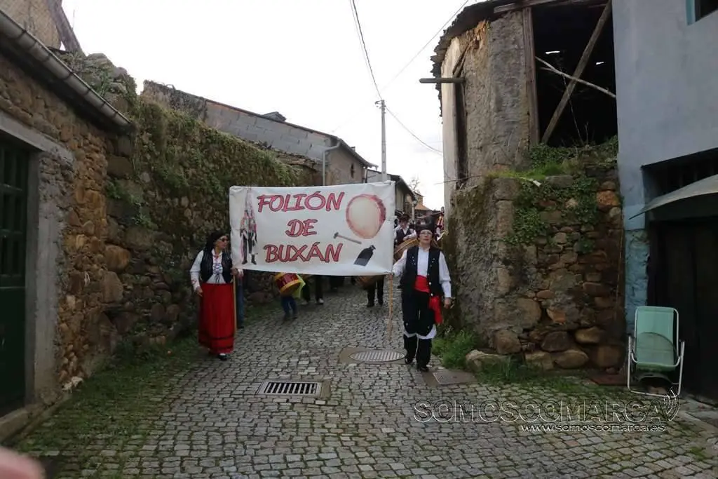 O Folión de Buxán, estivo acompañado por dúas das súas máscaras caracterizadas pola careta branca e un sombreiro do que colgan cintas de cores case até os pes e no que se pode observar no fronte unha boneca..
