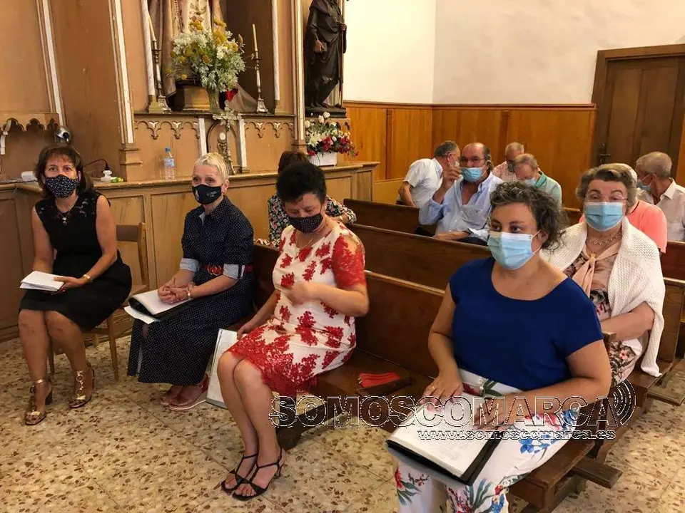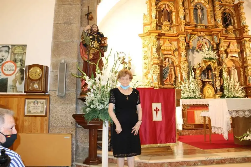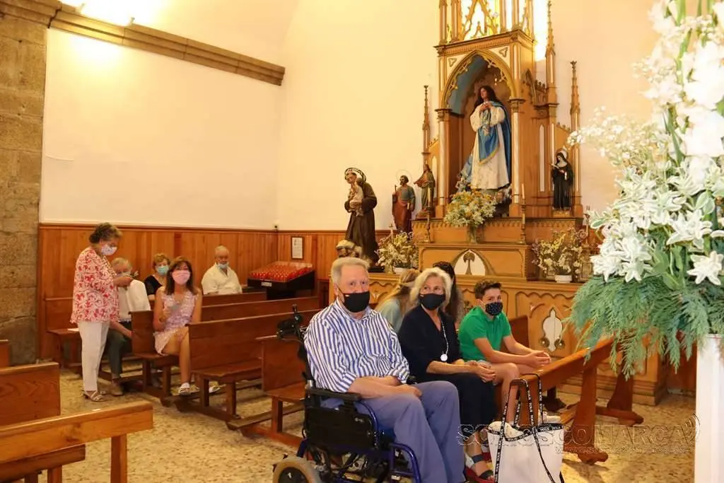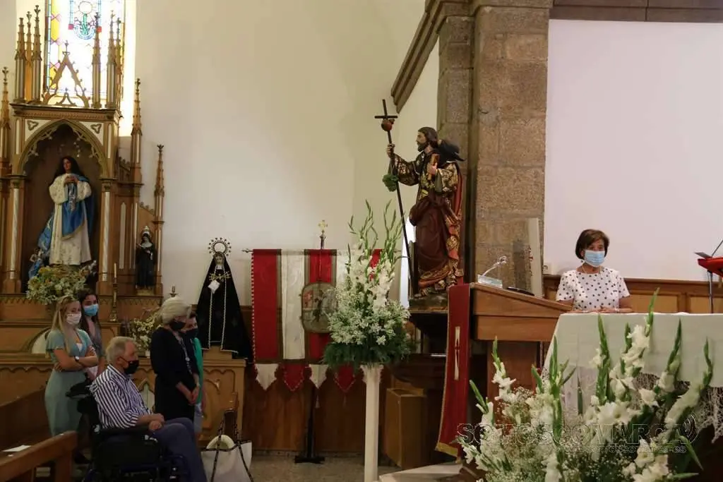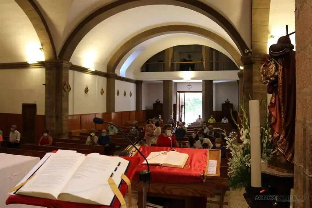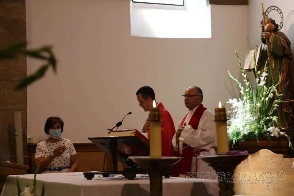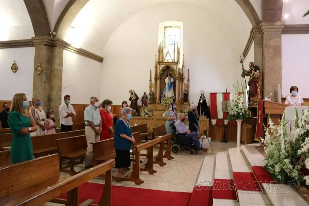 Con un pouco de retraso celebrouse a misa solemne na honra do Santiago, iso si con todas as medidas de seguridade que todos os fieis respectaron, os dous metros de separación e xel a entrada. Ás portas da igrexa os membros de Protección Civil da vila, José Benito, Sueiro e Fernando foron requeridos polo párroco, Lisardo Paradelo, para impedir o paso ao recinto si se completaba o aforo.