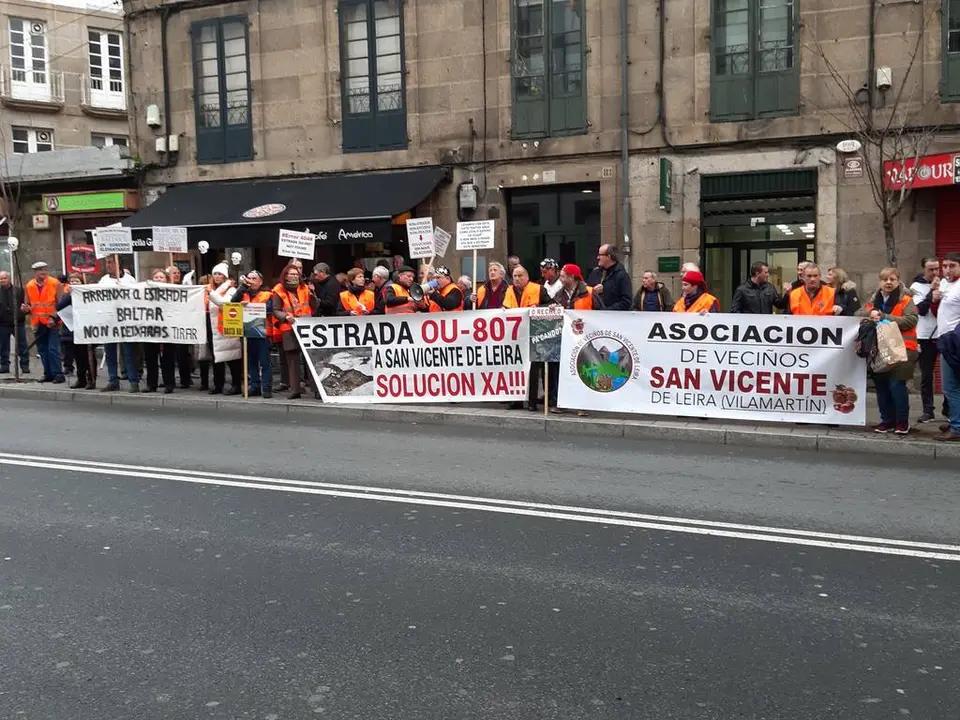 A golpe de cacerolas se han concentrado frente al Pazo Provincial de la Diputación de Ourense los vecinos y vecinas de San Vicente de Leira. Su principal objetivo era continuar recordando y reivindicando el arreglo de la carretera OU-0807 que da acceso al pueblo. A la concentración, que comenzó a las 11.30 horas de la mañana, acudieron alrededor de 100 personas entre los que había vecinos, el alcalde de Vilamartín — Enrique Álvarez Barreiro—, miembros del concello y los diputados del PSdeG-PSOE.