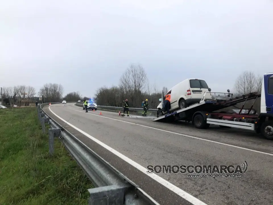 Durante esta mañana se han realizado trabajos de rescate y retirada en la zona, algo que llamaba la atención de los vehículos que circulaban por la N-120. Uno de estos, se despistó y, tras perder el control del coche, chocó contra la barrera de seguridad metálica —bionda—, aunque no hubo que lamentar daños personales.