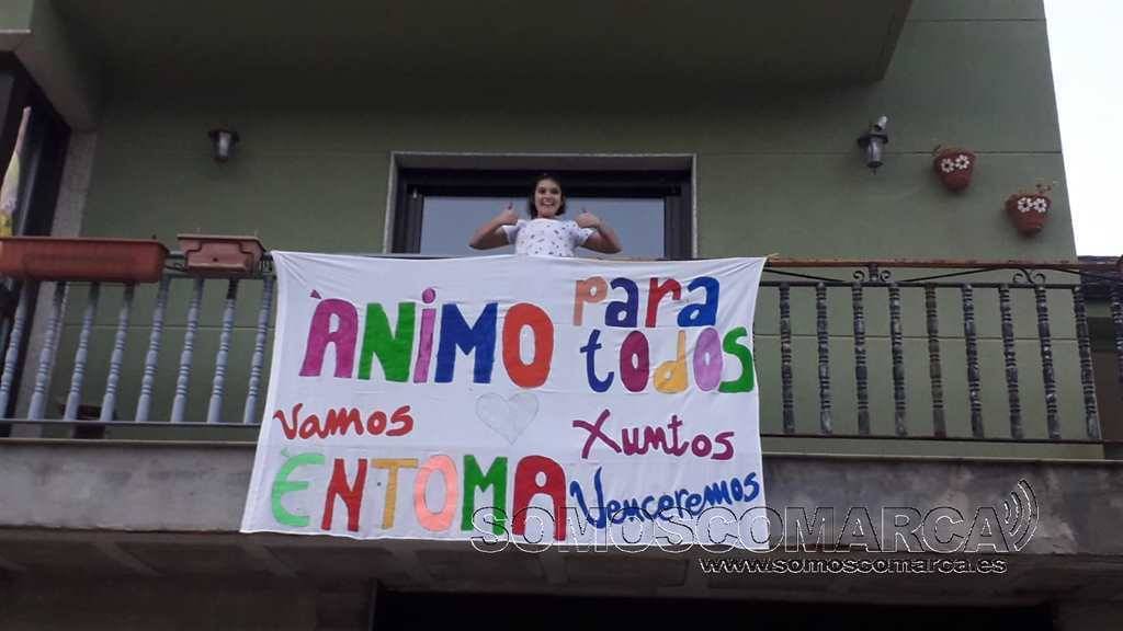 Anxo de 13 años y su hermana Enma de 3 también pintaron su pancarta. En este caso, en el balcón de su casa en la calle Barco de Ávila de O Barco, sobre los colores del arco iris se puede leer «Quédate na casa». En la parte inferior del gran balcón en unos folios «LO-CON-SE-GUI-RE-MOS».