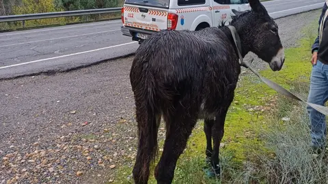 La burra Carolina, que se ha mostrado muy dócil, llevaba unas cuerdas en las patas cuando lo encontraron. «Tuvimos que cortar los cables», relata.