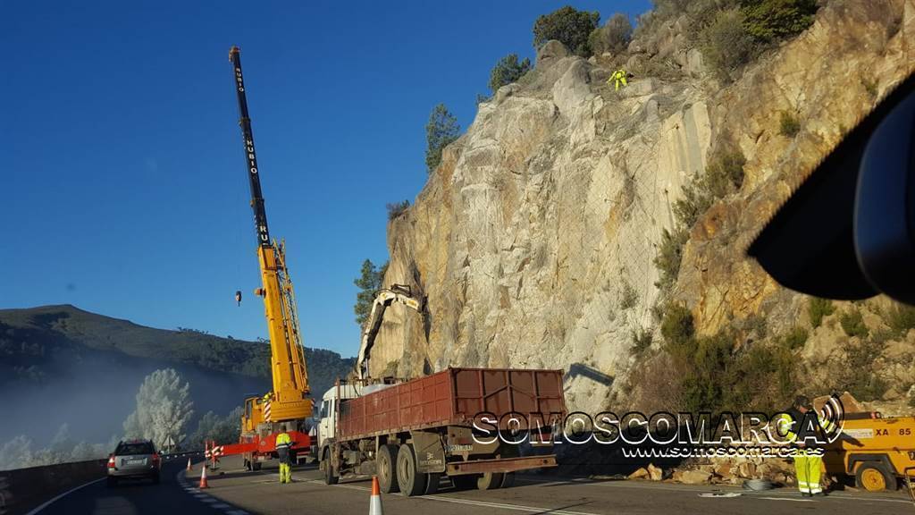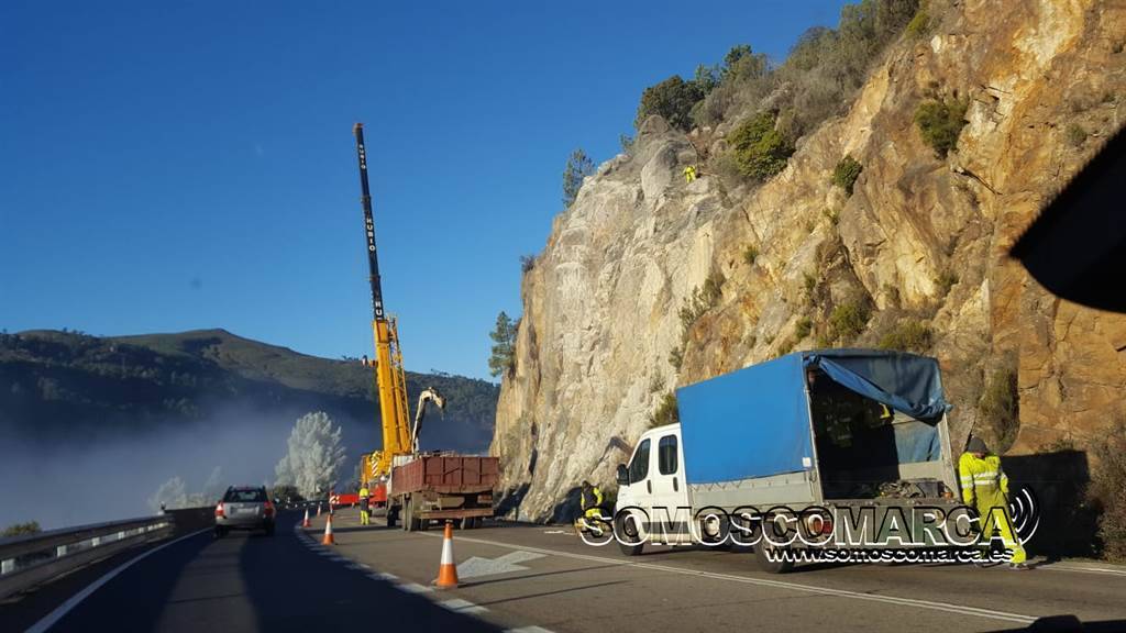 Las obras de mantenimiento en un talud de la carretera N-120, en el PK. 470,00 mantienen cortados dos carriles del vial. Los vehículos necesarios para la obra, así como una grúa de grandes dimensiones utilizada para la reparación, se hallan en los dos carriles de la derecha sentido Rúa-Quiroga —al pasar el Parque de Bomberos de Valdeorras en la curva, debajo de la fábrica de de automoción situada en el Parque Empresarial de As Pedreiras (A Rúa).