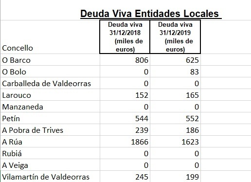 Curiosamente, el concello de O Bolo contaba con un deuda viva en 2018 de cero euros mientras que en 2019 era de 83 000 euros.