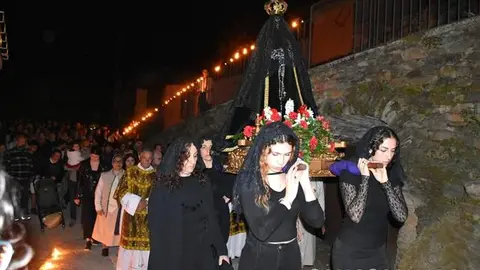 La imagen de la Virgen enlutada recorrió la pasada noche las calles de Petín y O Castro acompañada por la luz de los caracoles. Una noche calurosa en la que la gente salió a la calle para acompañar a la madre del Nazareno en su soledad.