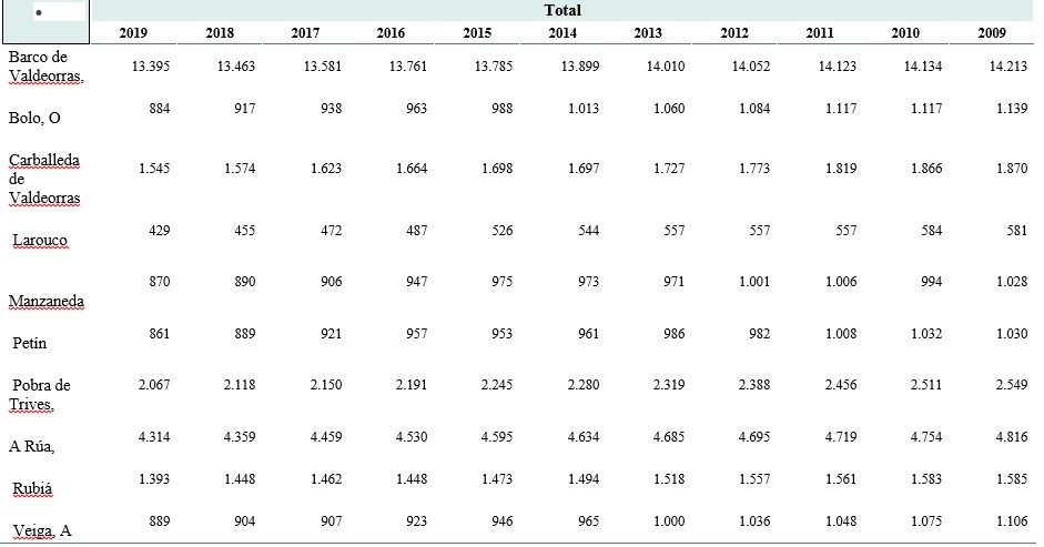 Y es que son muchos los concellos valdeorreses que en este tiempo bajaron del millar de habitantes. Así puede versen en O Bolo donde actualmente el padrón contabiliza 884 habitantes, en Petín donde hay 861 o en A Veiga donde 889 vecinos forman parte del padrón.