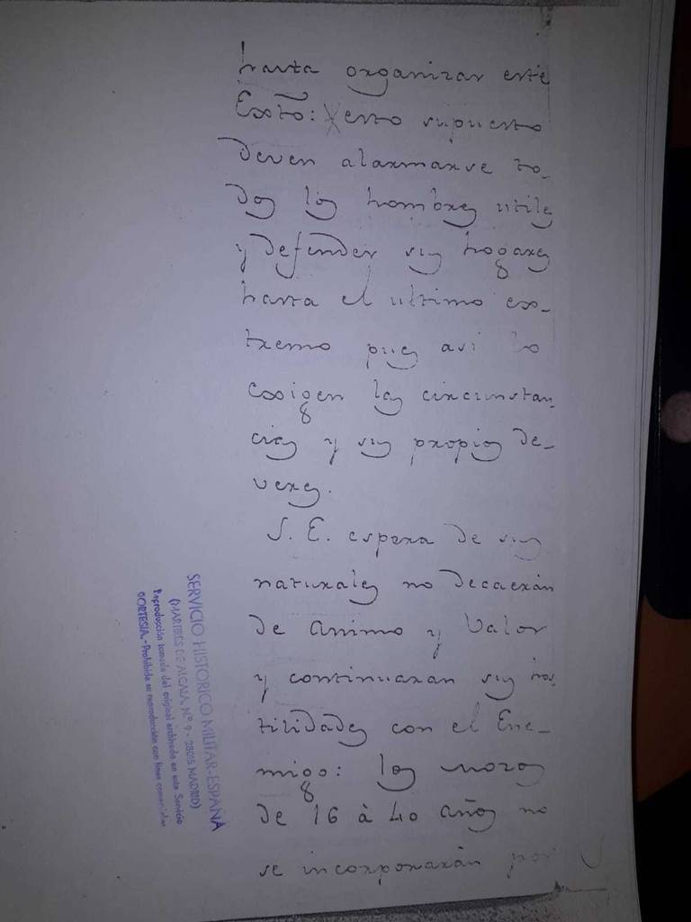 Es por supuesto que deben alarmarse todos los hombres útiles y defender sus hogares hasta el último extremo pues así lo exigen las circunstancias y sus propios deberes. Su excelencia espera de sus naturales que no decaerán de ánimo y valor y continuarán sus hostilidades con el enemigo.