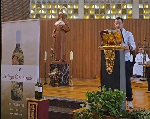 El gerente de O Cepado, tras levantar la jarra de zumo de la uva recién pisada ante la fotografía antigua de Jesús Nazareno, donada por Aurelio Blanco Trincado; se dirigió hacia la imagen de Santa Rita en cuyos pies depositó el mosto, para luego dirigirse al atril desde donde procedió a la lectura de la ofrenda.