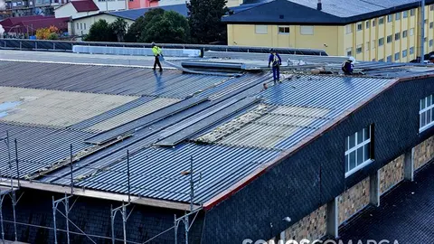 El pabellón municipal de Calabagueiros de O Barco. continúa con su proceso de mejora. Esta semana han comenzado los trabajos para renovar el tramo de cubierta que da hacia el campo de fútbol, una zona que aún no contaba con paneles solares y que se está acondicionando con ese objetivo.