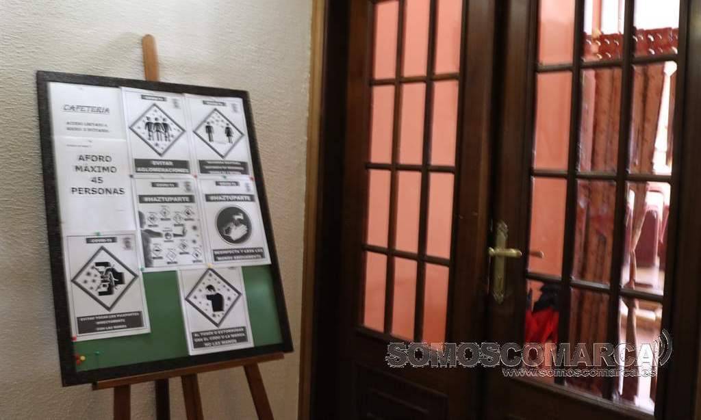 Nos recibe una mesa con hidrogel y mascarillas ya en el fondo de las escaleras y antes de entrar en el local social donde se ubica la cafetería un gran tablón donde se anuncian todas las medidas que se deben tomar de acuerdo al protocolo Covid. Y es que, si algo tiene claro esta nueva directiva ante la pandemia es, la seguridad para sus socios. Así, el local esta restringido a 45 personas aunque por medidas podrían entrar 60, pero prefieren restringir el acceso para que no «halla problemas».