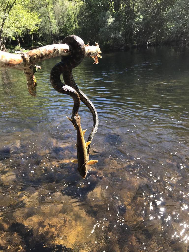 Los integrantes del grupo que habían elegido el lugar para pasar la tarde, observaron entre conversaciones y risas algo raro en el agua, al aproximarse vieron como una impresionante «culebra» que pasaba de los dos metros se estaba «zampando» una enorme trucha. Se acercaron curiosos a ver qué era lo que pasaba; mientras que a unos la estampa les producía rechazo y pena a los otros la escena les parecía de lo más natural. «Nosotros somos de pueblo y aunque nos daba algo de grima lo vimos normal. Lo único que teníamos miedo era por si la hacía algo al perro», contaba Sabela.