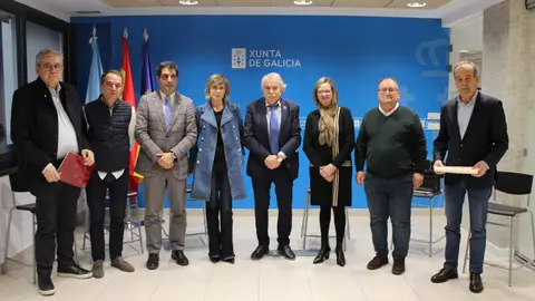 Tras la visita, el presidente Rueda mantuvo una reunión con el presidente y el gerente del Clúster da Pizarra de Galicia, Eliseo López y Severino González, así como con el resto de miembros de la junta directiva, para conocer de primera mano los problemas que atraviesa el sector.