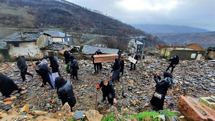Vestidos de negro, unha vintena de veciños transportaron un cadaleito de madeira, decorado coa silueta de casas e cunha cinta na que se podía ler a mensaxe «Os seus veciños non te esquecen». A acción quixo representar o sentimento de loito dun pobo que, segundo denuncian, séntense abandonados e enterrado en vida.