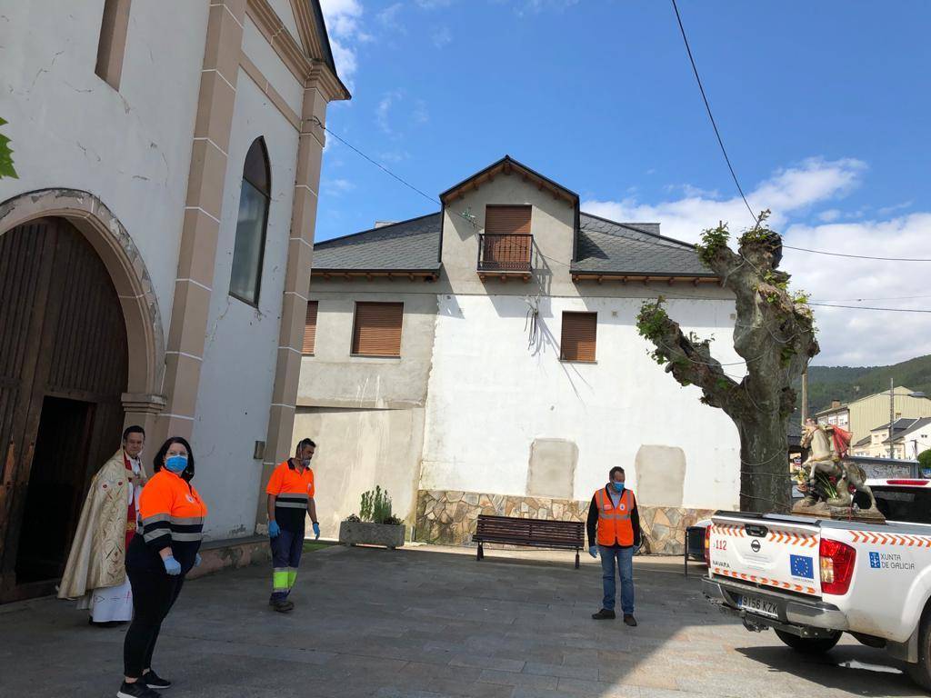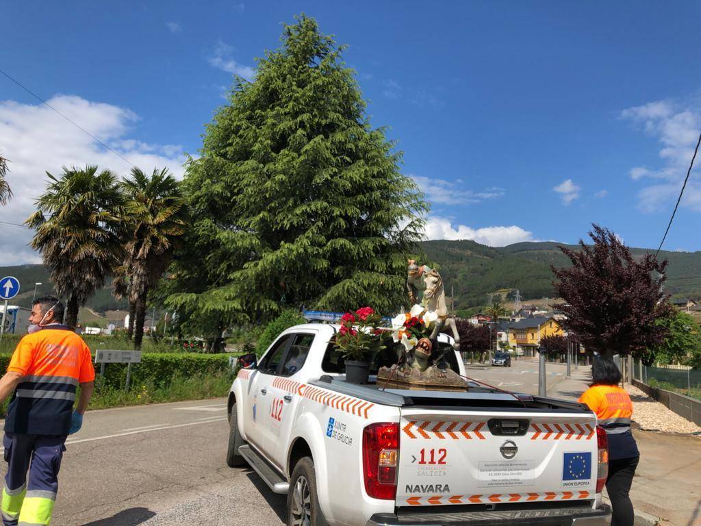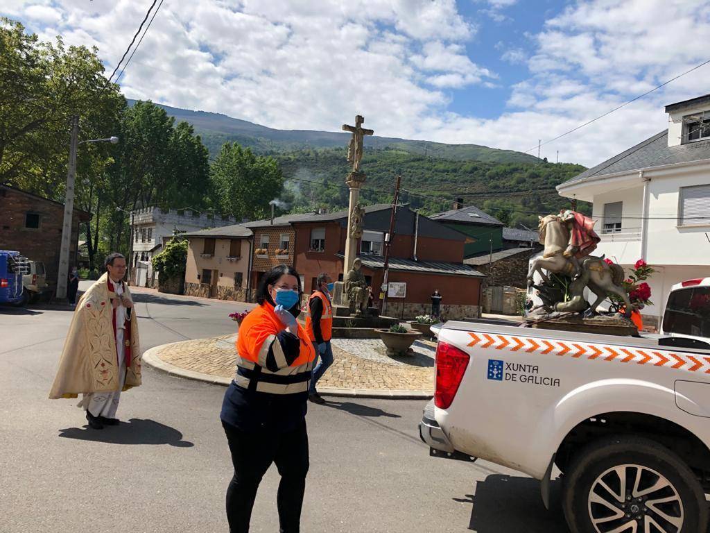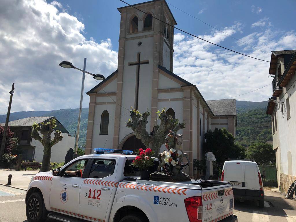 Finalmente, esta mañana San Xurxo recorrió las calles de Vilamartín de Valdeorras. A diferencia de anteriores ocasiones, en las que era portado y acompañado por los fieles, esta vez fueron los miembros de Protección Civil y el alcalde y el párroco de Vilamartín los que le acompañaron.