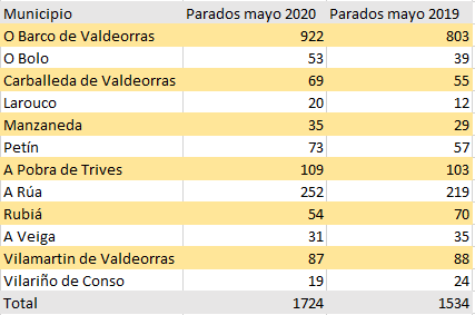 Curiosos son los datos que ofrecen lugares como Rubiá, A Veiga, Vilamartín o Vilariño de Conso donde había más parados en mayo de 2019 que en la actualidad. Aunque las cifras son mínimas, (Rubiá saco a 16 personas del desempleo, A Veiga a cuatro, Vilamartín a una y Vilariño a cinco) es curioso con relación al panorama actual.