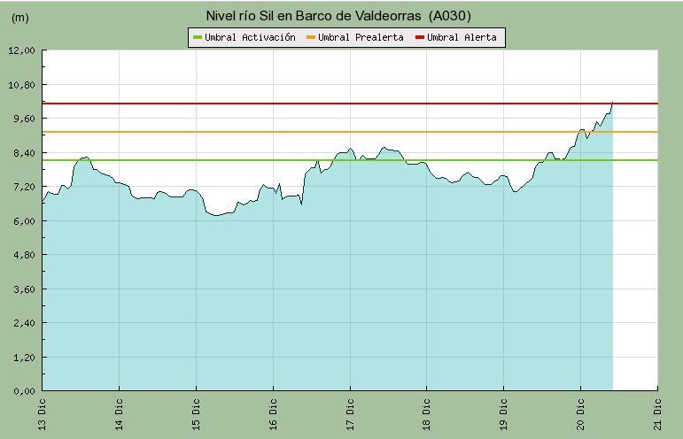 A las 11.00 horas de este viernes, 20 de diciembre, el SAIH de la Confederación indica que el caudal del río a su paso por O Barco de Valdeorras se encuentra en 10,20 metros, es decir, que ha alcanzado ya el umbral de alerta por el posible desbordamiento.