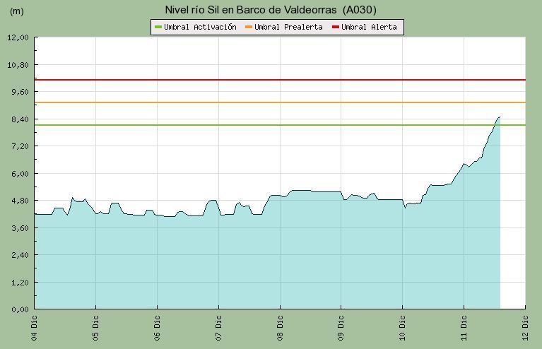 A las 8.00 horas de la mañana el SAIH de la Confederación indicaba que el caudal del río a su paso por O Barco de Valdeorras se encontraba en 7.13 metros, una cifra que en tan solo 4 horas —a las 12.00 horas— se situaba en 8.16 metros.