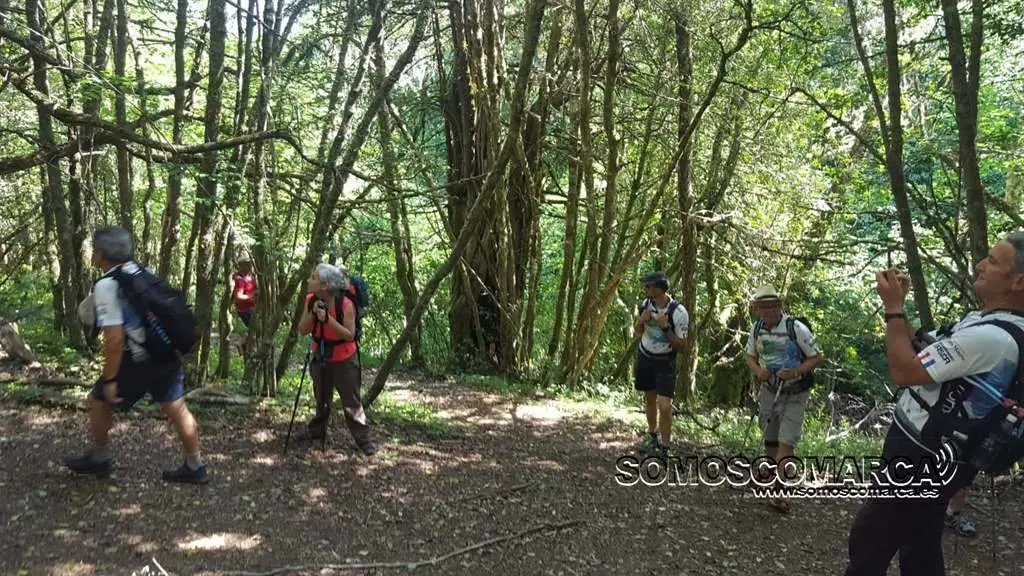 Empezaron la ruta en Río Oscuro subiendo por una pista de considerable pendiente. A los 2 Km se toparon con la cabaña de Luis donde cogieron lo imprescindible para la ruta, « lo demás se quedó ahí con la intención de volver para la comida», nos cuentan. Seguidamente se metieron por un «sendero muy sombrío y altos niveles de humedad», dirigiéndose al arroyo Brañarronda para ver sus bonitas cascadas. «En la subida hemos visto grandiosos tejos, uno de ellos el más voluminoso de la Península Ibérica hicieron falta 5 personas para poderlo cercar, no tenían otra forma de medirlo», cuenta una emocionada Ceferina al recordar el camino. «No menos imponentes eran los acebos que estaban presentes en casi toda la ruta», prosigue. Serbales, avellanales, hasta 30 especies diferentes se pueden encontrar en este bosque el el que hasta han comido probado plantas de «diferentes sabores».