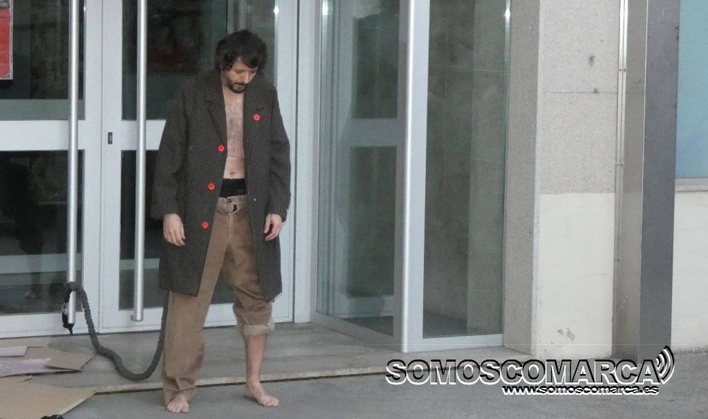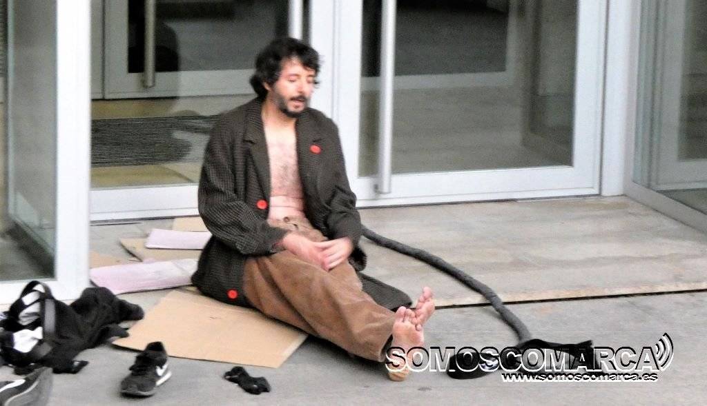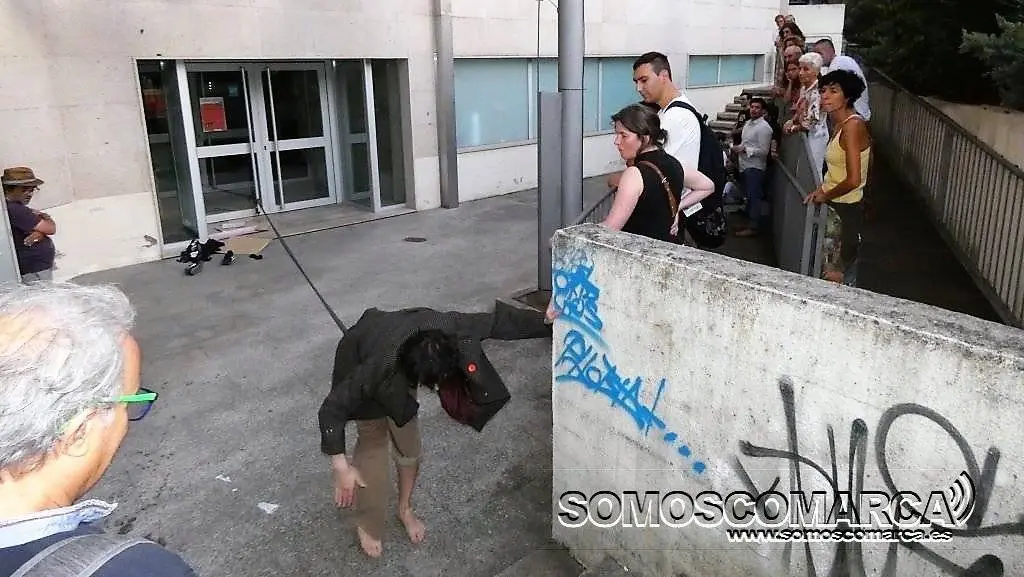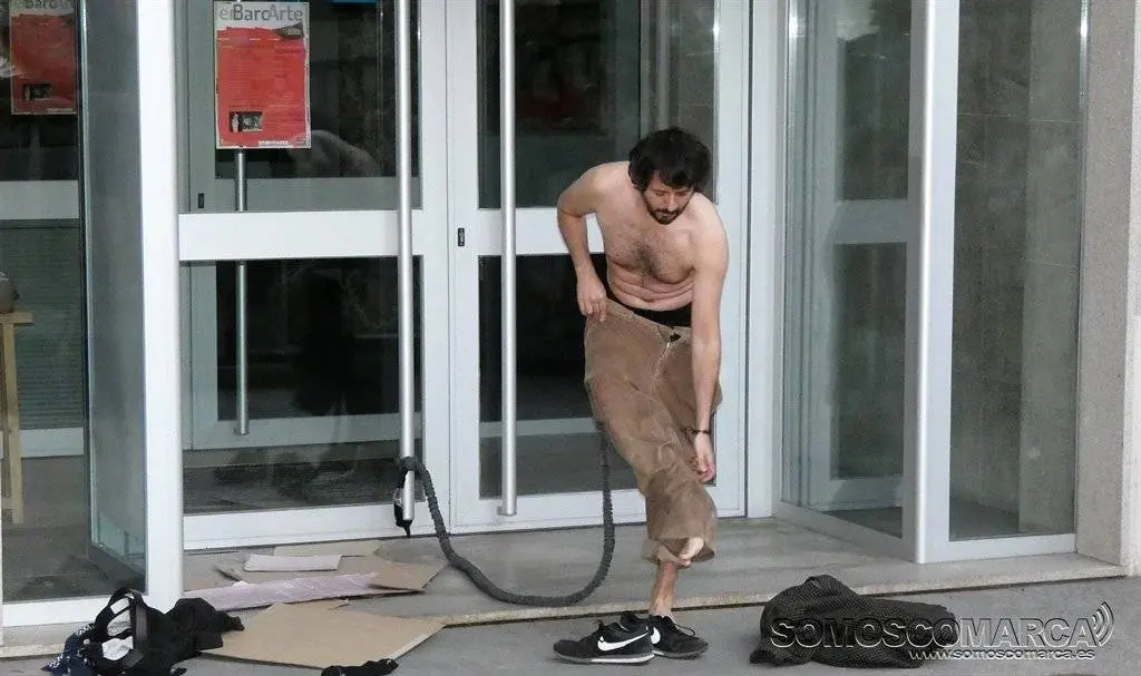 La performance ha sido creada por el propio DosoFran y la barquense Francisca Neira. El artista se ata a una cuerda elástica con una mirada que ancla, paraliza. Sin palabras, a través de gestos y movimiento, transmite el relato.