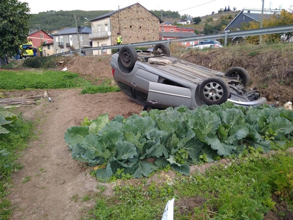 El vehículo en el que viajaba un hombre y una mujer, subió por encima de la bionda y acabó precipitándose, desde aproximadamente 2 metros, a una huerta quedando volcado entre los repollos. Según testigos presenciales el conductor comentó que se había quedado dormido. Los ocupantes del Peugeot fueron trasladados al Hospital Comarcal Valdeorras para observación aunque en principio no presentaban lesiones de importancia. La mujer se resintió del hombro.